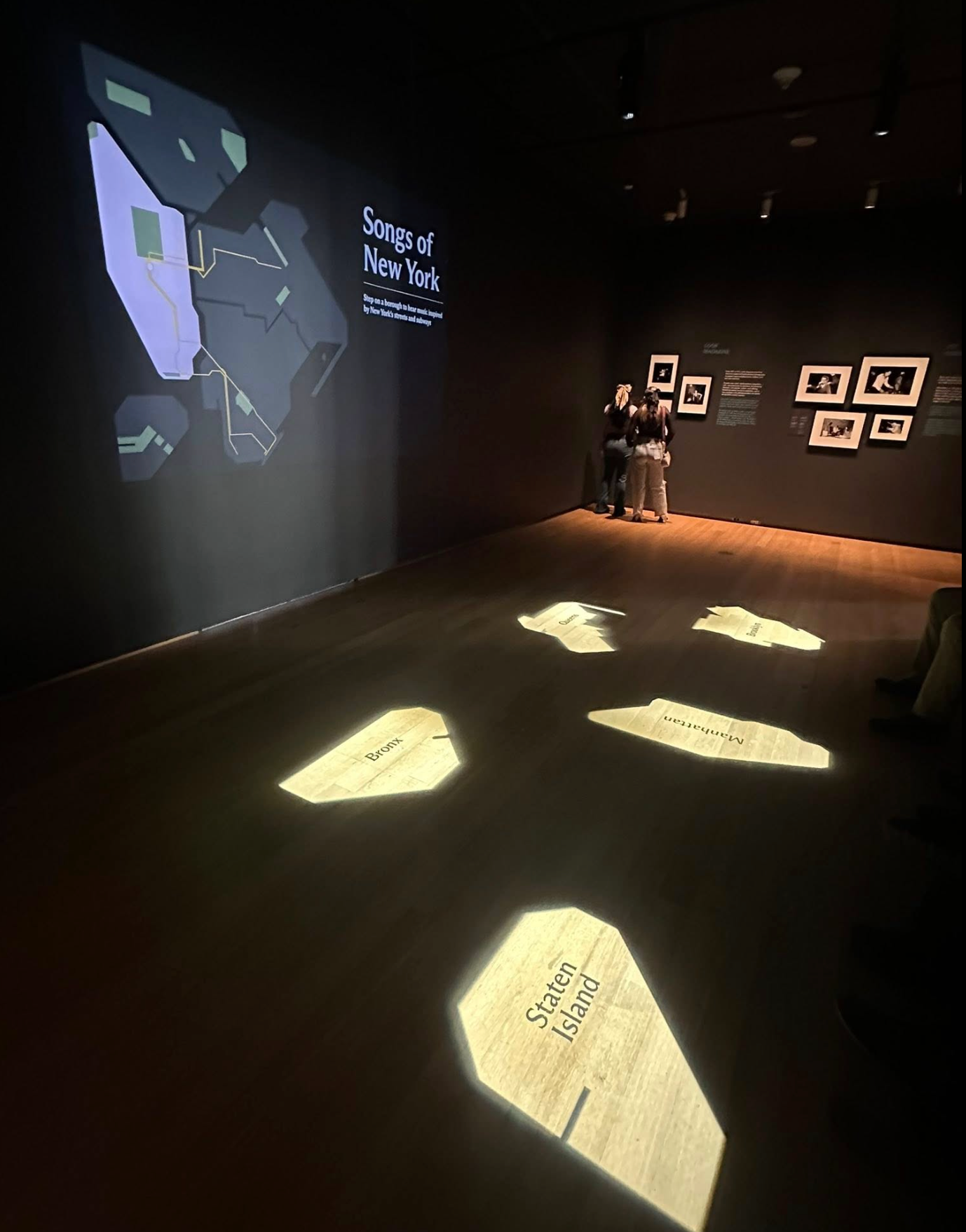 One of the most striking elements is the interactive floor projection. The five boroughs are illuminated beneath your feet, and as you step onto each one, a defining artist from that borough springs to life. Staten Island triggers the unmistakable sound of Wu-Tang Clan, Queens fires back with the raw punch of Ramones, and so on. It’s playful, intuitive, and quietly brilliant—turning the visitor into part of the performance.