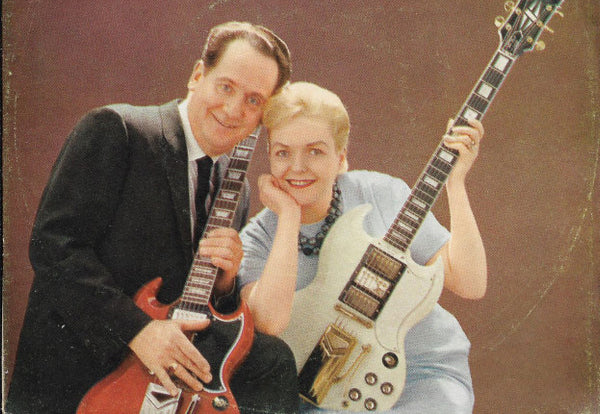 Les Paul and Mary Ford posing with Cherry “Standard” and Polar White “Custom” SG Les Paul models, 1961.