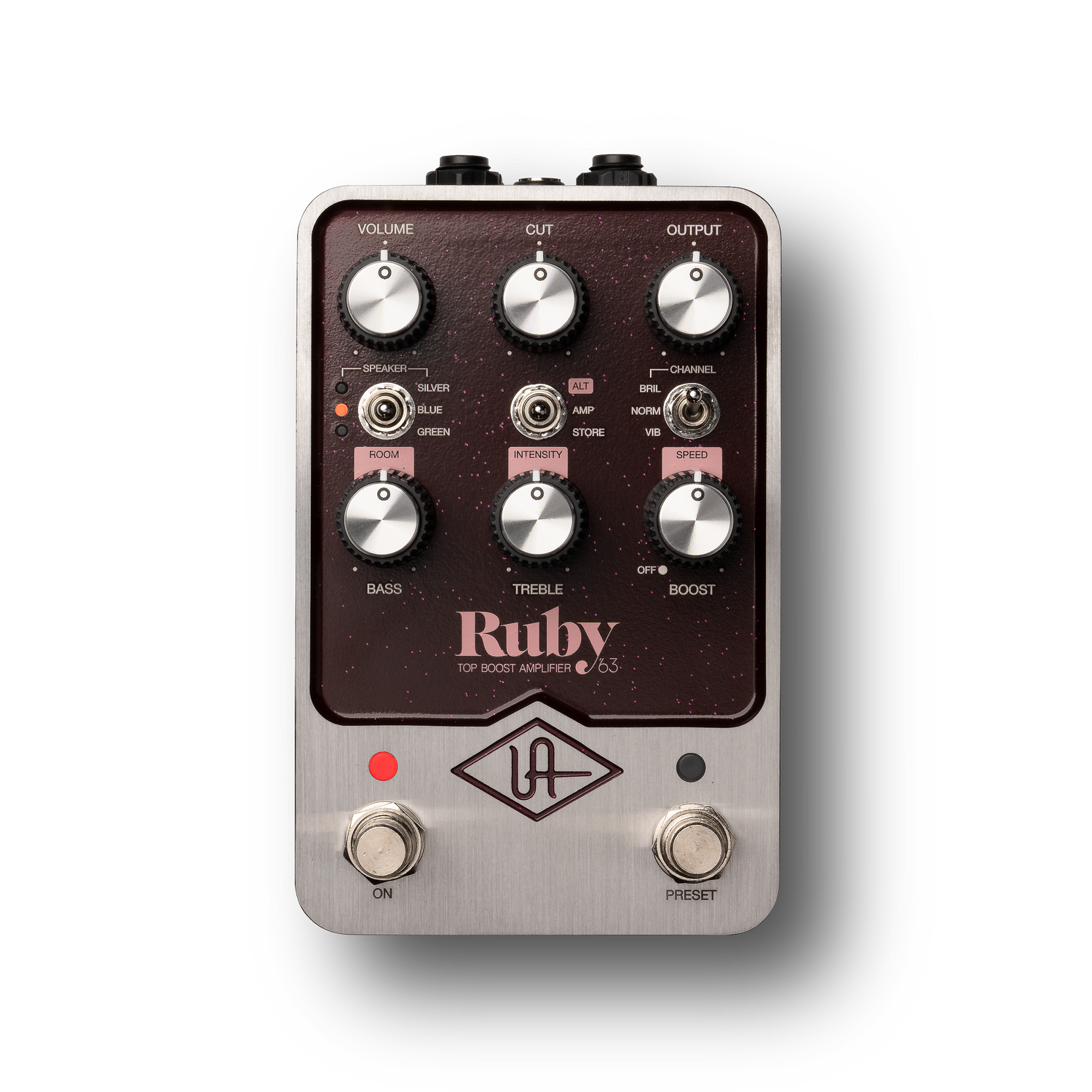 The UAFX Ruby '63 Top Boost Amplifier pedal gives you the quintessential British valve amp beloved by artists and producers for over 60 years, from Queen to U2 to Radiohead. Built on powerful dual-engine processing and world-class UAD modeling, Ruby '63 delivers choirboy cleans, complex overdrive, and classic vibrato.