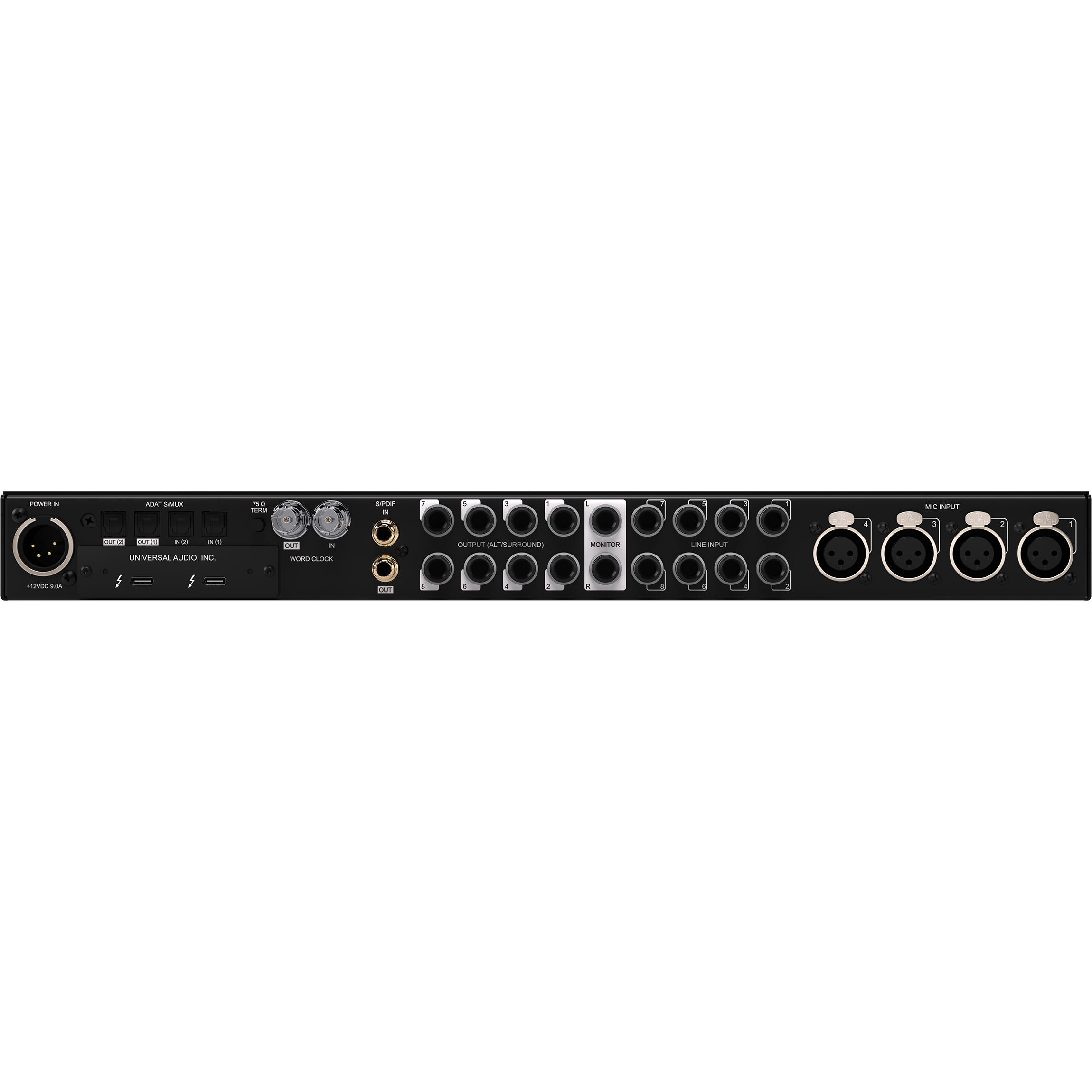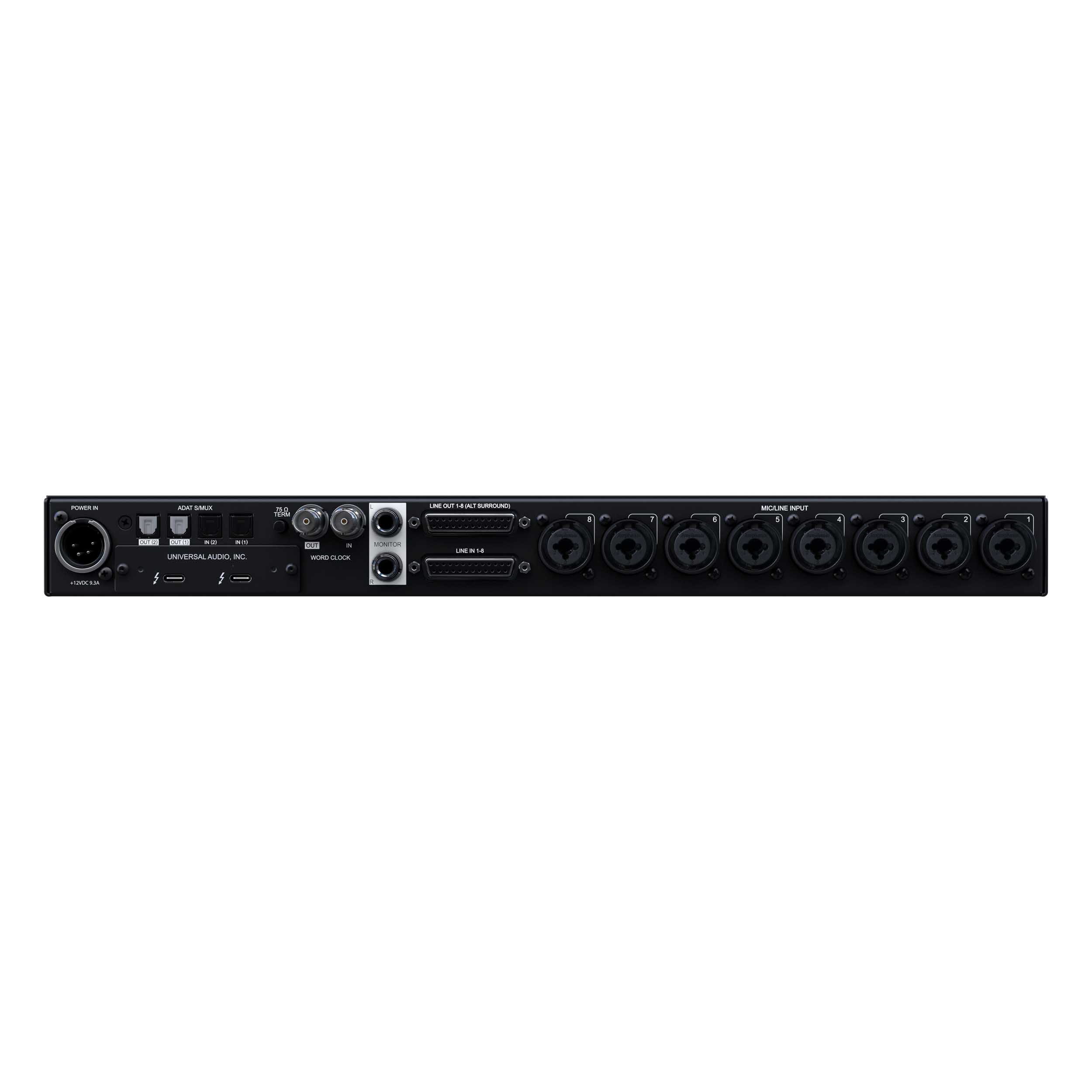 - Four Unison™ mic preamps, two Hi-Z instrument inputs, eight 1/4" line inputs, two optical Toslink I/O (ADAT S/MUX), RCA coaxial I/O (S/PDIF), word clock I/O (BNC)