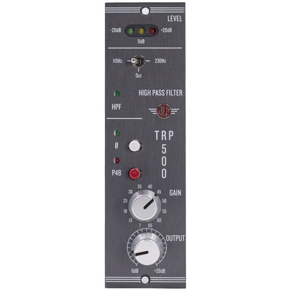 Based on the circuit and topology of the company’s original AEA TRP preamp, the TRP500 has the low noise, musical sonics, and ultra-high gain and impedance (100,000 Ohms) that AEA is renowned for. The TRP500 excels at drawing out the warmth and lush sound of ribbon mics as well as other top-level microphones. With up to 85 dB of quiet DC-coupled gain, minimal path architecture, and a gentle 115 Hz or 230 Hz high pass filter, this preamp puts as little as possible between you and your audience.