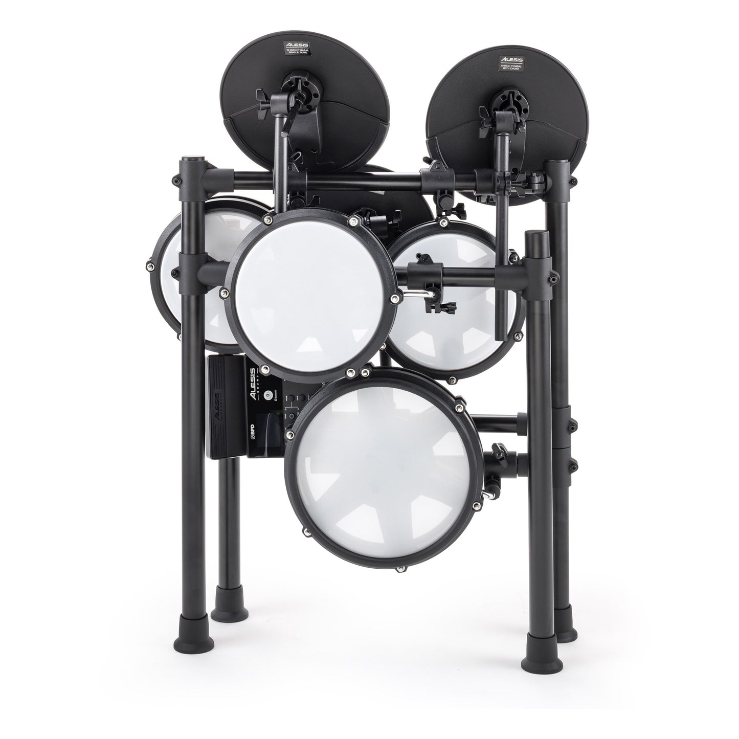 The Nitro Max Kit includes everything you need to start playing drums right away – all in a lightweight, compact, stylish design. A hard-wearing cable snake, drumsticks, and drum key are all included. There’s also a high- quality single-beater Alesis kick pedal, and an expressive hi-hat control pedal. The drum pads, cymbals, and module all mount to a four-post rack that stands firm no matter how hard you play. Already a compact, space- saving design, you can even fold Nitro Max even smaller for easy storage – perfect for bedrooms, living rooms, playrooms, or any other area where space is limited.