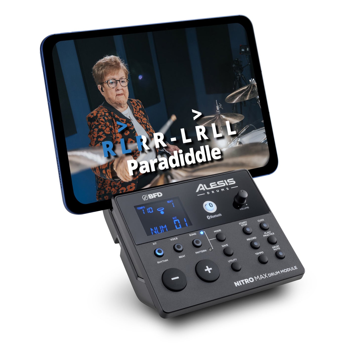 Nitro Max offers everything you need to learn or improve drumming skills, and to get good – fast. Premium mesh heads offer a responsive, enjoyable playing experience with minimal external noise, so you can practice whenever you like. A wide range of ultra-realistic drum sounds provide a truly immersive drumming experience, whatever your style of music. And a host of different learning tools help you practice and improve your timing and playing. Plus you can seamlessly play along with your favourite tracks from Spotify, Apple Music and other streaming services via Bluetooth connectivity.