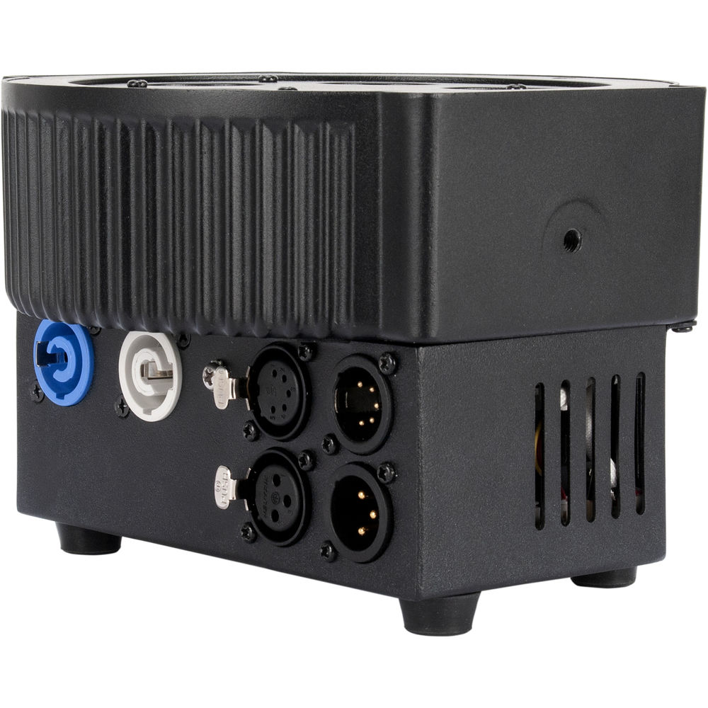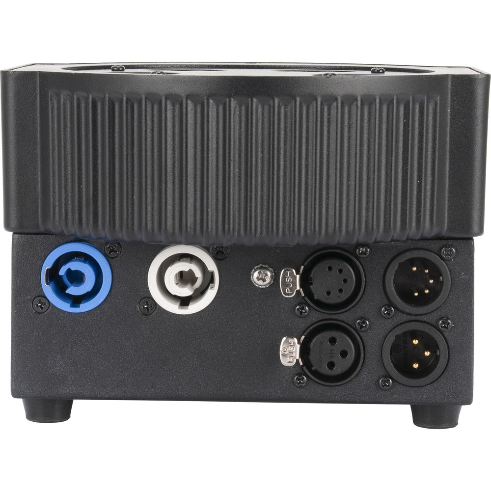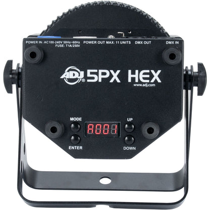 5PX HEX professional features include: 4 DMX modes (6, 7, 8, & 12 channel), 5 operational modes, 5 dimming curves, flicker free operation and a 4-Button DMX menu with digital display. Daisy-chain up to 8 units together via the fixtures built-in IEC In/Out power connectors.