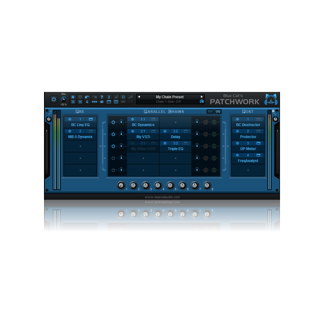 - Build your own effects chains: up to 8 "pre" and "post" plug-ins slots to chain plug-ins in series.