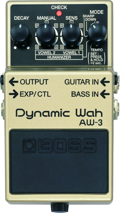 The BOSS AW-3 Dynamic Wah pedal gives guitarists a wide range of classic auto-wah and dynamic wah effects, plus a new "Humanizer" effect which can simulate human vowel sounds. A Bass input provides a variety of funky wah sounds for bass guitar.