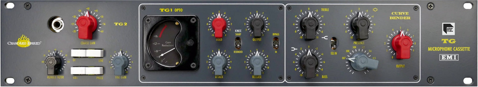 The three sections of the TG Microphone Cassette comprise Chandler Limited’s TG2 Pre-Amp coupled with a Curve Bender EQ section, including Treble, Bass, and Presence controls, and an independently patchable TG1 Opto Limiter.
