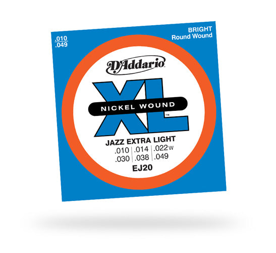 D'Addario XL EJ20 Nickel Wound Jazz Extra Light Electric Guitar Strings are crafted of wound, nickelplated steel for bright, distinctive tone.