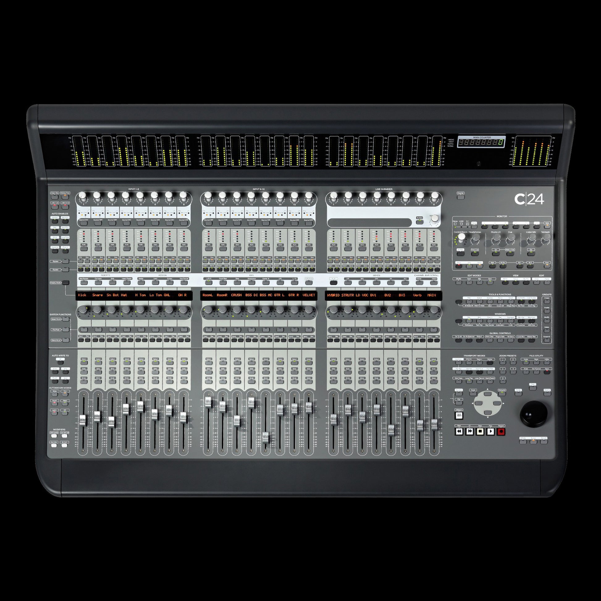 C|24 provides direct hands-on access to recording, editing, routing, and mixing functions in Pro Tools software. The control surface features 24 bankable channel strips, each with a touch-sensitive, motorized fader; high-quality rotary encoder and LED ring; dedicated Mute, Solo, and channel select illuminated buttons; and dedicated Input, Record, EQ, Dynamics, Insert, Send, and Automation buttons. It also features many more Edit commands, windows management controls, and dedicated buttons than Control|24, plus a Soft Keys section that allows future features to be added as Pro Tools software evolves.