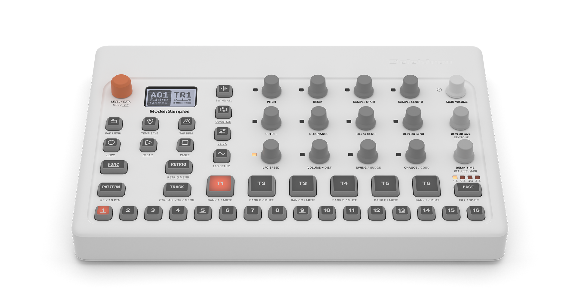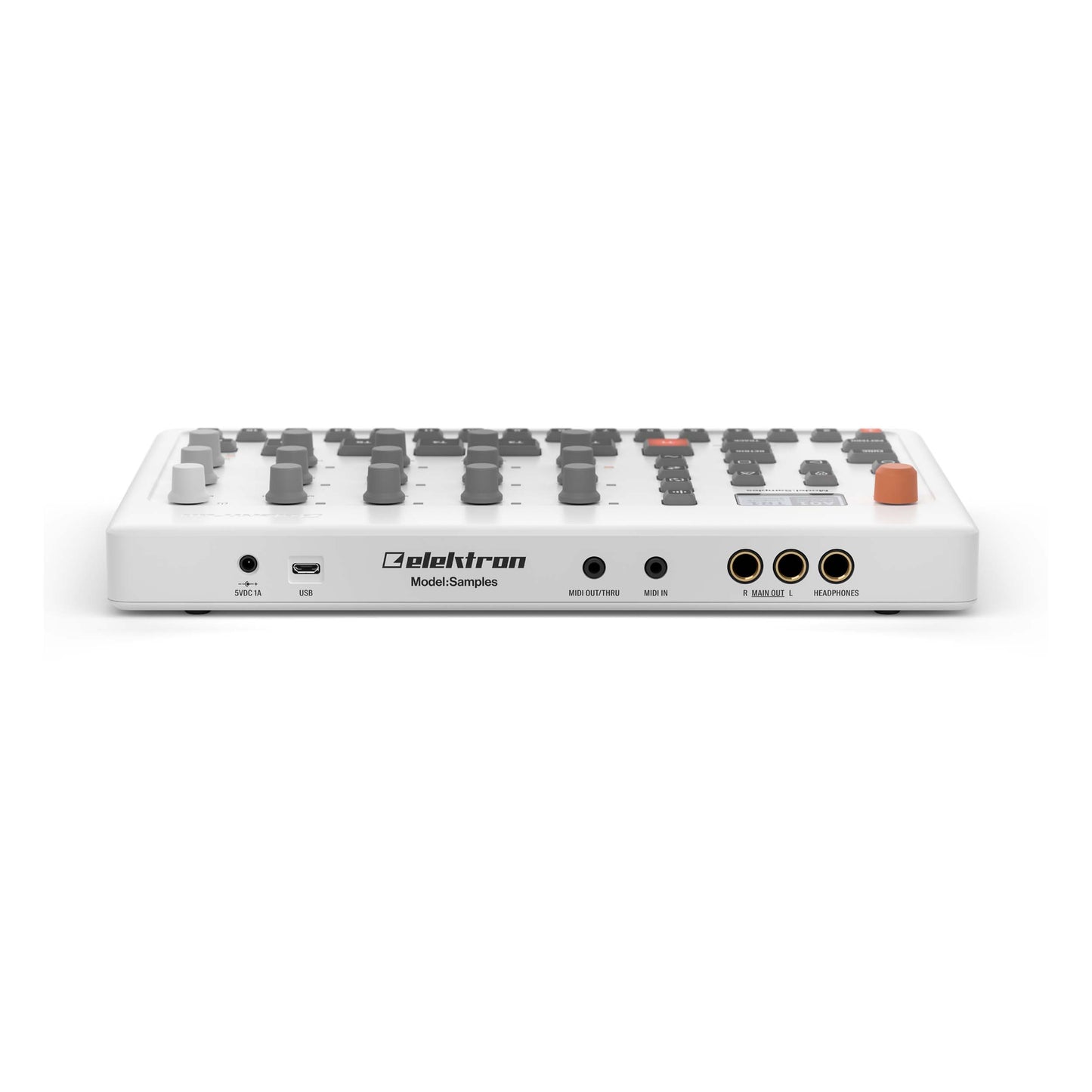 Model:Samples features our most complete set of front panel controls, each function with its own knob. They're all right there; just grab a knob and twist it. Unleash your music spontaneously using the durable velocity-sensitive pads. Record your every move live, or design your rhythmic creation in detail using the superb Elektron sequencer.