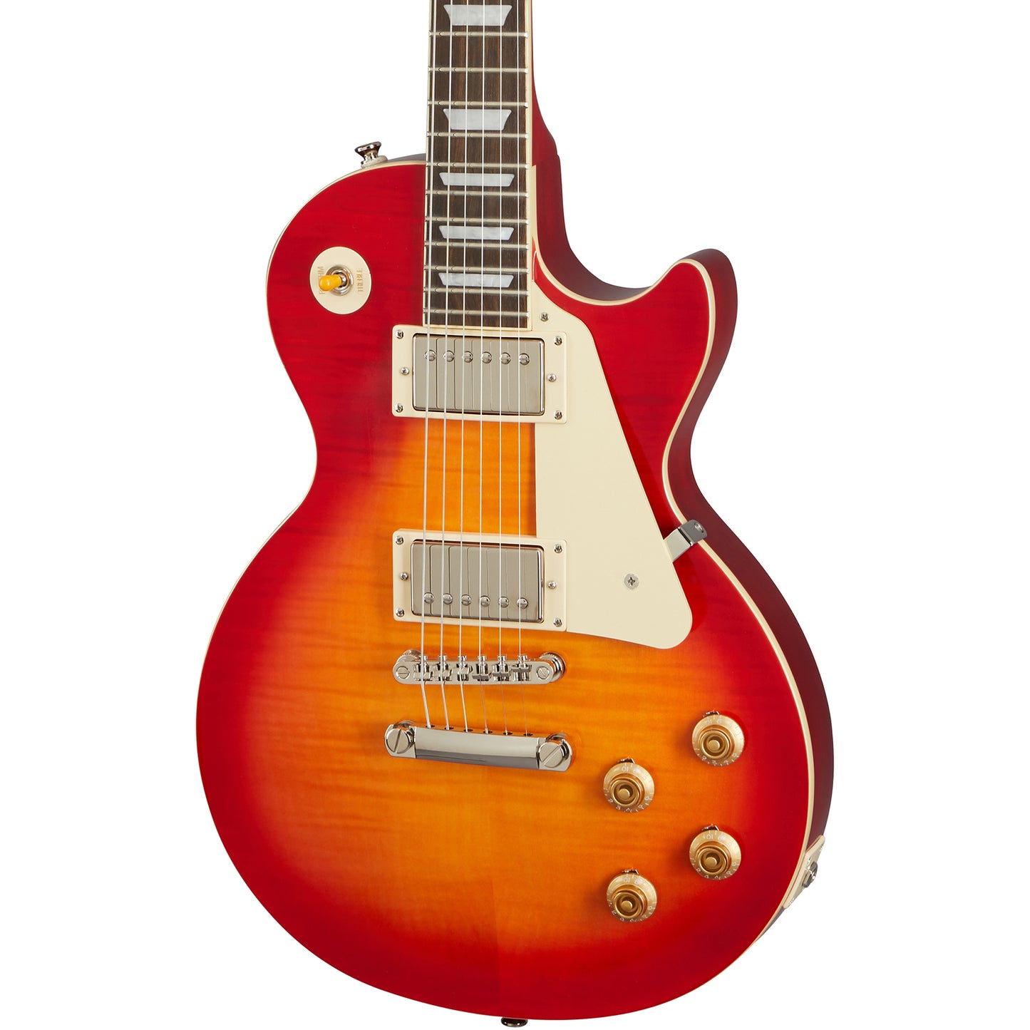 Made in partnership with the Gibson Custom Shop, the Limited Edition 1959 Les Paul™ Standard is Epiphone's stunning recreation of the rare vintage classic. Featuring a mahogany body with a AAA figured maple top, comfortable 1959 handrolled neck profile with long neck tenon, aged gloss nish, Gibson USA BurstBucker™ 2 & 3 humbucking pickups, Switchcraft® selector switch and output jack, CTS® pots, 50s era wiring, Mallory™ capacitors, non-beveled pickguard, new Epiphone Deluxe vintage tuners, and a vintage-style brown hard case. It also comes with an Epiphone Limited Edition metal medallion toggle switchplate and a Certificate of Authenticity.
