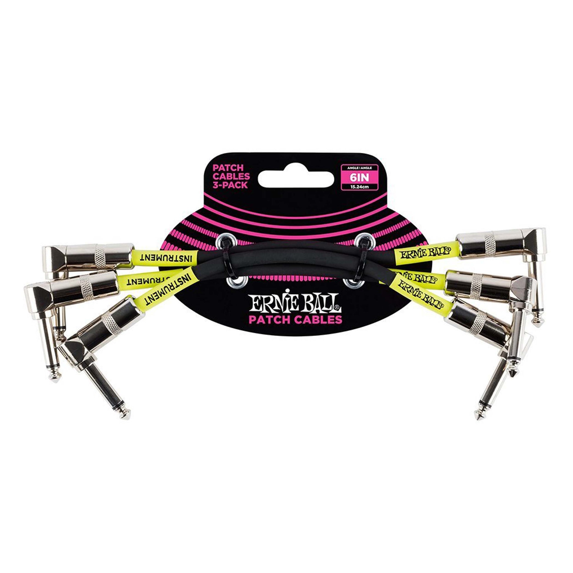 Ernie Ball patch cables feature a high-quality design made with superior components that are built to last. Dual conductors and multiple shielding materials deliver reliably clear, quiet tone. This pack contains 3, 6in cables, with a black Sleeve and angled ends.