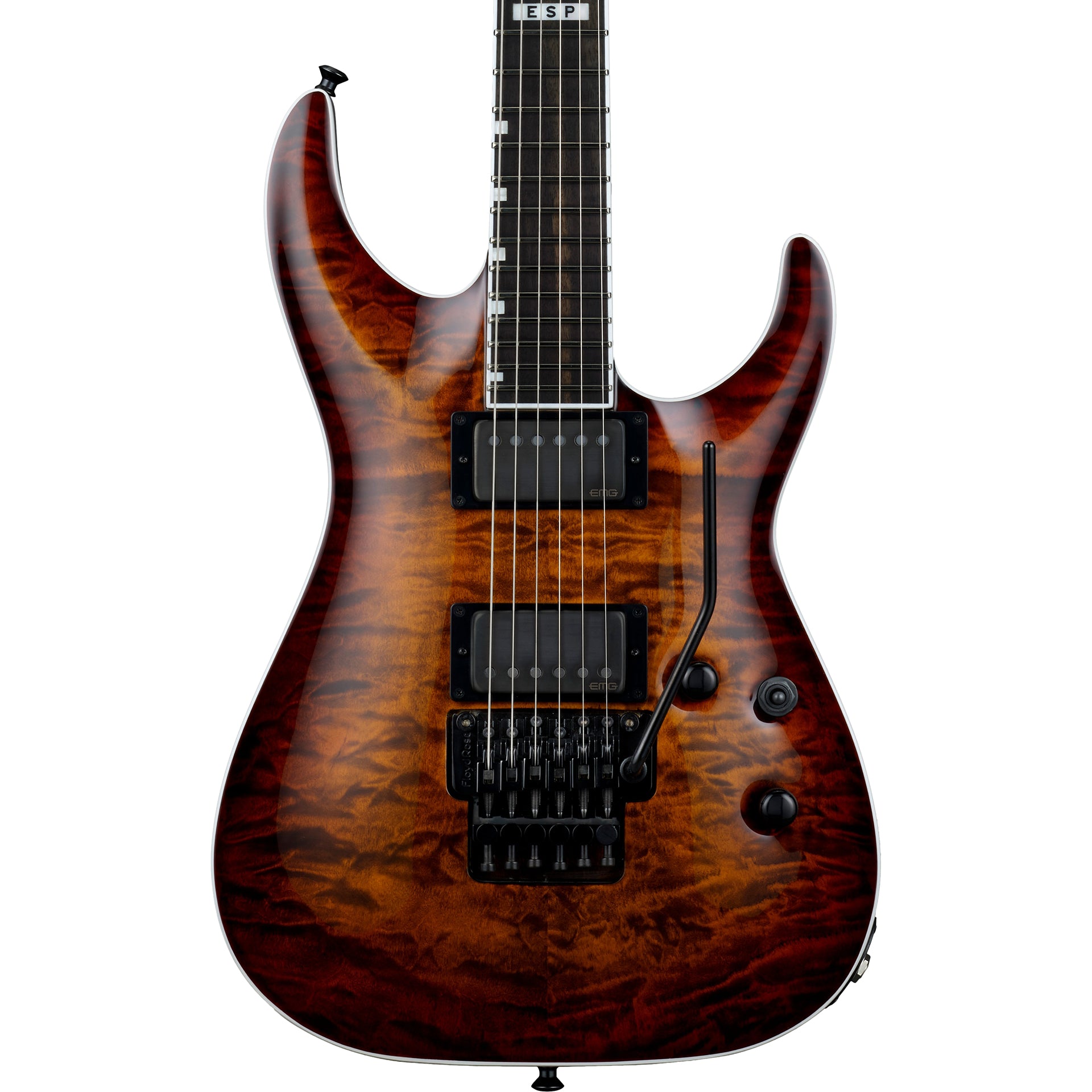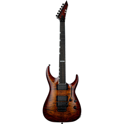 Available in a classy Tiger Eye Sunburst finishes, the E-II Horizon FR-II is a guitar designed to handle literally any kind of music with serious professional results for recording and live performance. Formerly called “ESP Standard”, all ESP E-II instruments are created at our ESP factory in Tokyo, Japan, and are designed for professional players who accept no compromises in tone, feel, or reliability for their guitars and basses. The E-II Horizon FR-II offers neck-thru-body construction with a mahogany body and arched quilted maple top, and a three-piece maple neck that features an ebony fingerboard with 24 extra-jumbo frets and offset block inlays, and a satin finish on the back for super smooth playability. This guitar offers high-end components that include a Floyd Rose Original bridge, Gotoh locking tuners, and Dunlop locking strap buttons. Pickups on the E-II Horizon FR-II are EMG 66TW (neck) and EMG 57TW (bridge), both with Brushed Black Chrome covers and coil splitting with push-pull controls. Includes an ESP hardshell form-fitting case.