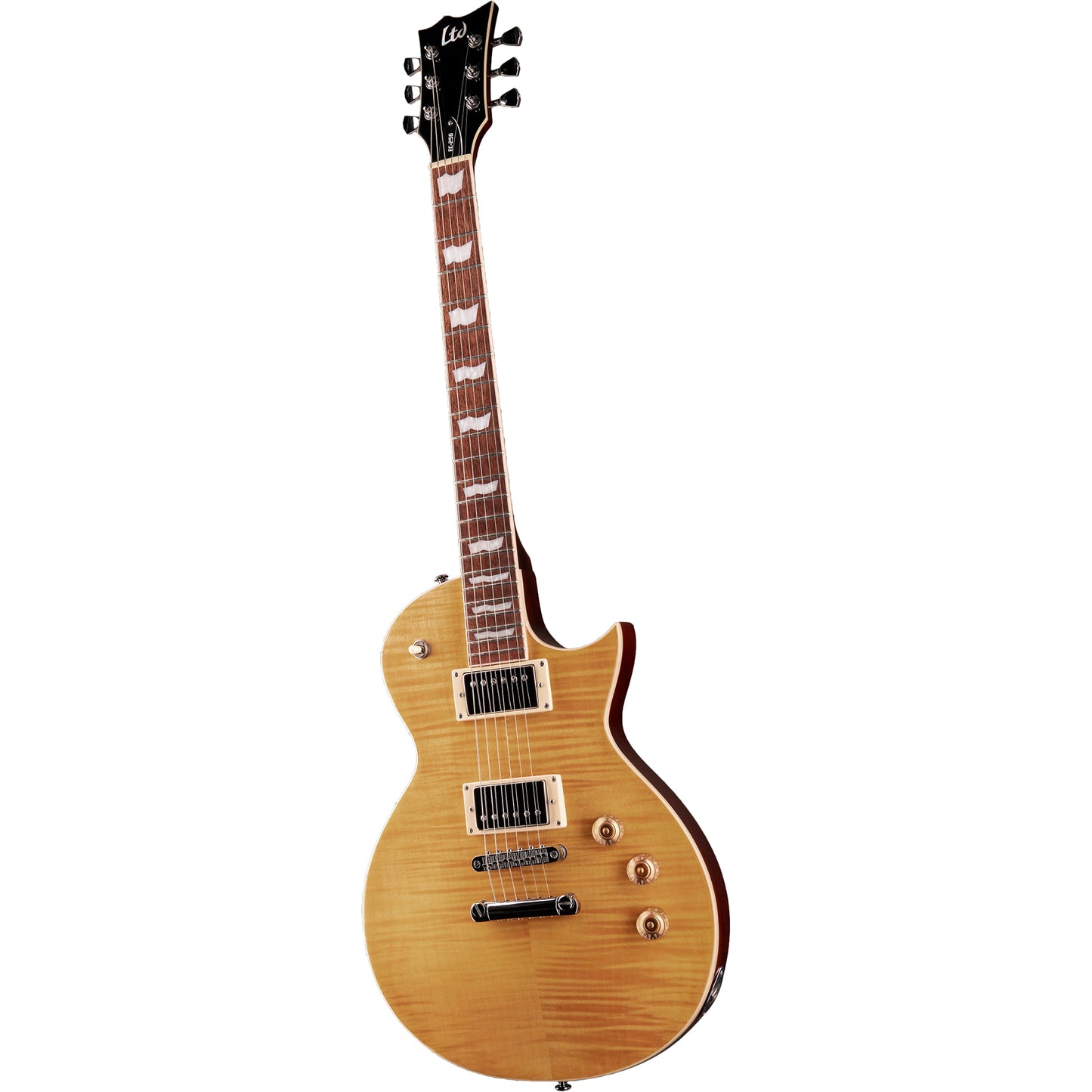 Guitars in the LTD 200 Series offer excellent value and provide higher quality than nearly any other instruments in their price range. The EC-256 Vintage Natural is a set-neck design with a mahogany body and great-looking flamed maple top, along with a comfortable and easy-to-play thin U-shaped three-piece mahogany neck and roasted jatoba fingerboard. It features a set of acclaimed ESP Designed LH-150 humbucker pickups with great tone for all kinds of music from rock to pop to metal, and for even more sonic versatility, the pickups can be split into single-coil with a push-pull control. Available in Vintage Natural finish.