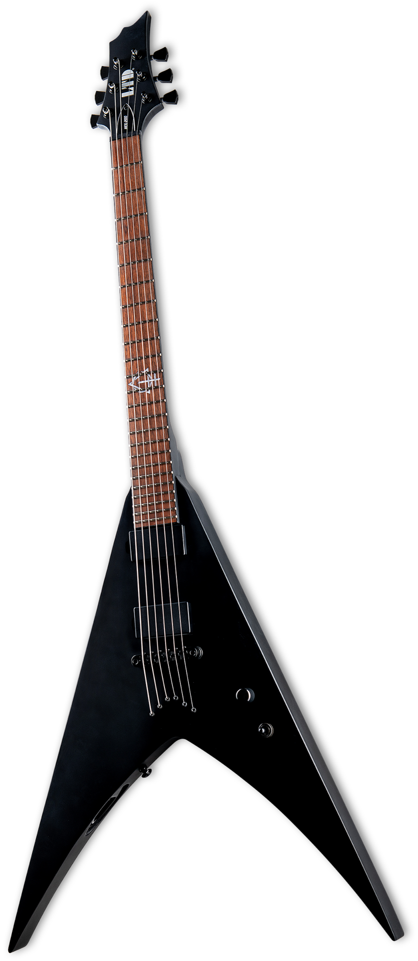 Behemoth frontman and chief creative force Nergal has been one of the most influential players in metal for over 30 years. With the LTD Signature Series HEX-200, all players are able to access the dark, menacing, and diabolical aesthetic of one of his most cherished guitars. The HEX-200 offers a symmetrical V-shaped body, created with bolt-on construction at 25.5” scale and pairing a mahogany body with a three-piece maple neck. This guitar has a roasted jatoba fingerboard with 24 extra-jumbo frets, and is devoid of markers with the exception of a special 12th fret inlay that draws artistically from the band’s Opvs Contra Natvram album. It includes black hardware, with an LTD tune-o-matic bridge and string-thru-body, LTD tuners, and a set of ESP Designed ESP LH-301N (neck) and LH-301B (bridge) passive pickups with black covers. A push-pull volume control allows you to split the pickups for single-coil tones.