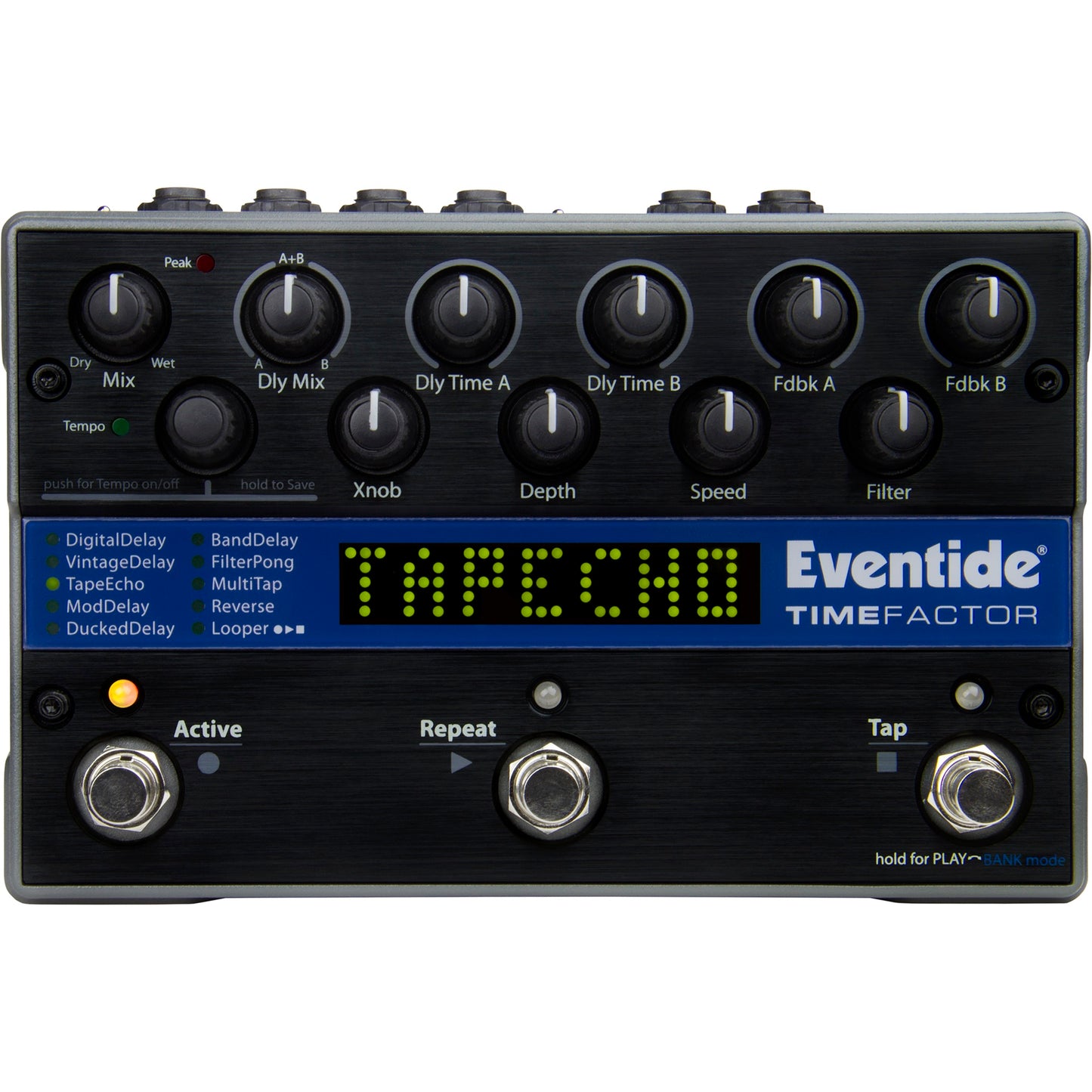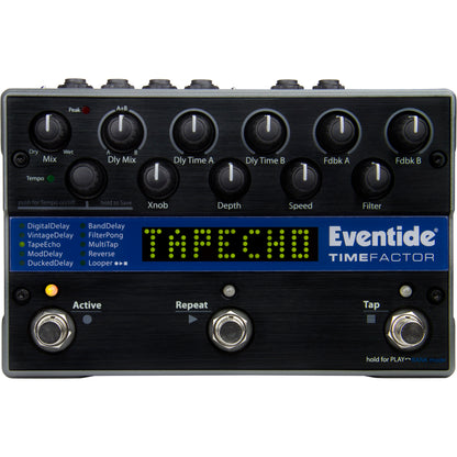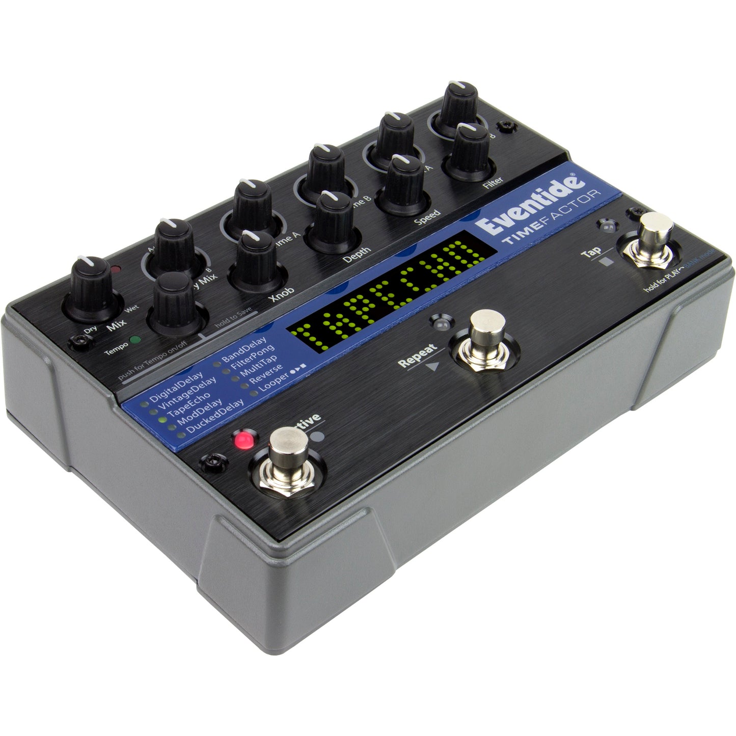 TimeFactor is a comprehensive dual delay pedal featuring 9 delay types with dedicated mix, time, and feedback controls for the two independent A and B lines. Delay types include classic Digital and Vintage, plus MultiTap, Reverse, Mod, Tape, Ducked, and AutoPan. Each effect can operate in stereo or dual-mono or straight mono and each can have its own tempo subdivision for creative rhythmic echoes. TimeFactor also includes a Looper with variable speed and loop head/tail editing.