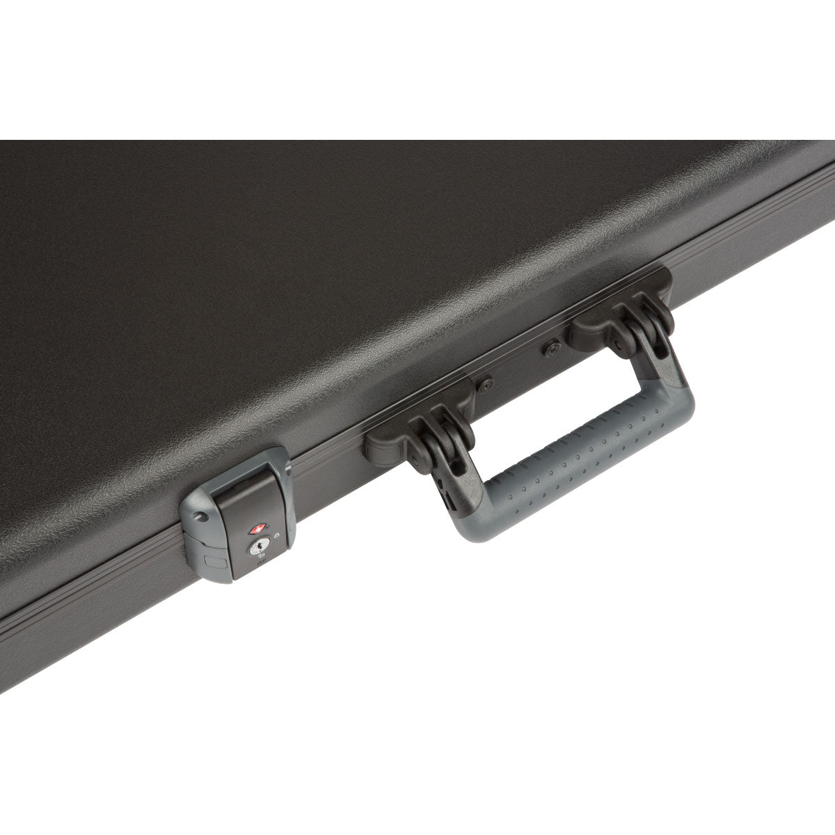 Deluxe Molded ABS Strat-Tele Guitar Case Black Gray/Silver. Transport and store your guitar or bass in style with this deluxe molded case, designed specifically for your instrument. Combining advanced materials with a new nested stacking design and TSA-approved locking center latch, this case will help your guitar arrive at its destination unharmed. From the rock-solid military grade outer shell to the comfortable handle (designed with feedback from Fender users) and high-grade plush interior lining, every element of this case has been engineered to create the ultimate in instrument protection. The large interior center pocket is the perfect place to stash accessories like picks, cable and straps, while helping to stabilize the neck during transport. Thanks to the rubberized feet on the hinged edge, you can enjoy additional stability-no more worrying about your case tipping over when you set it down.