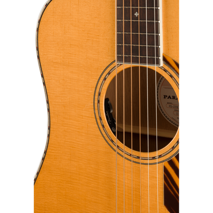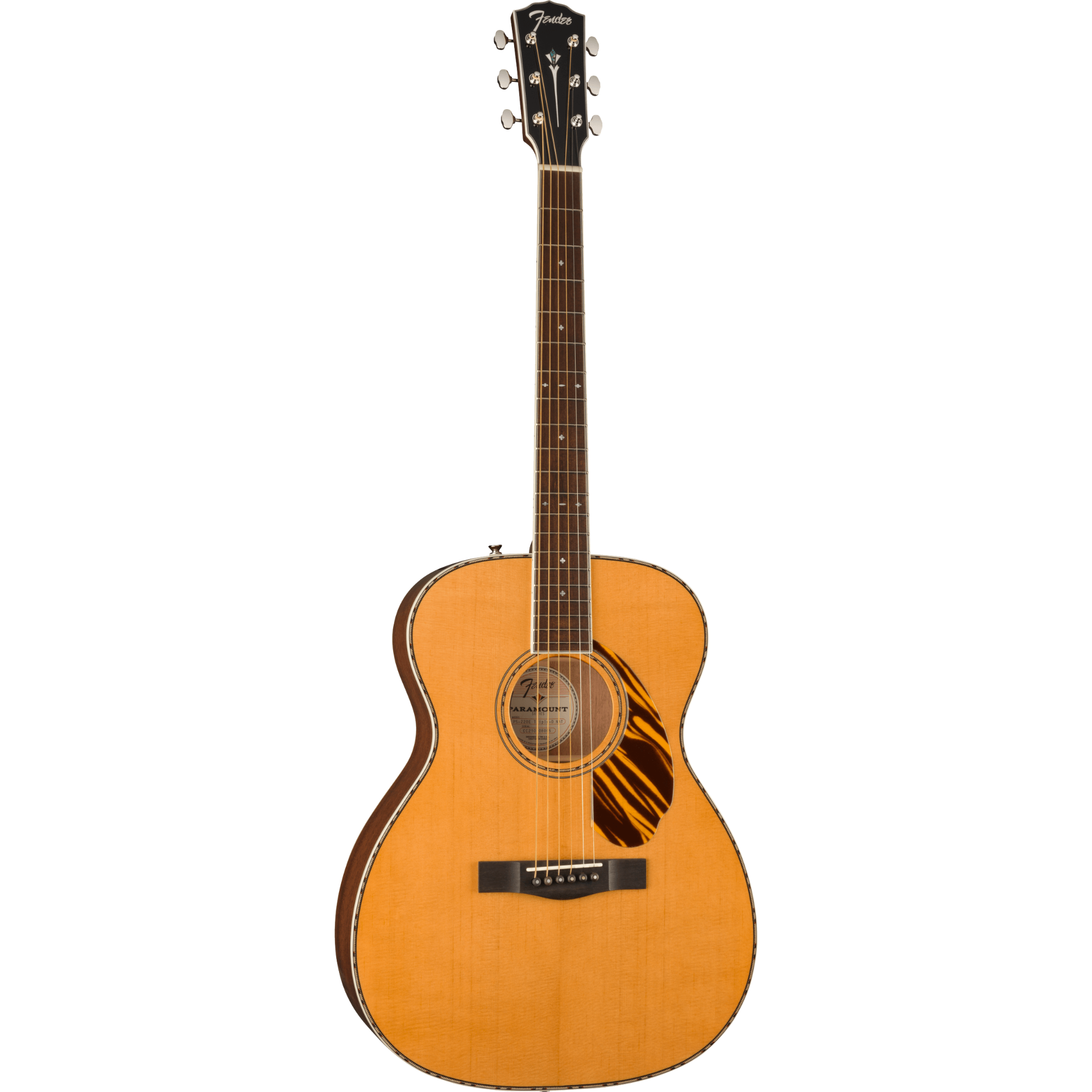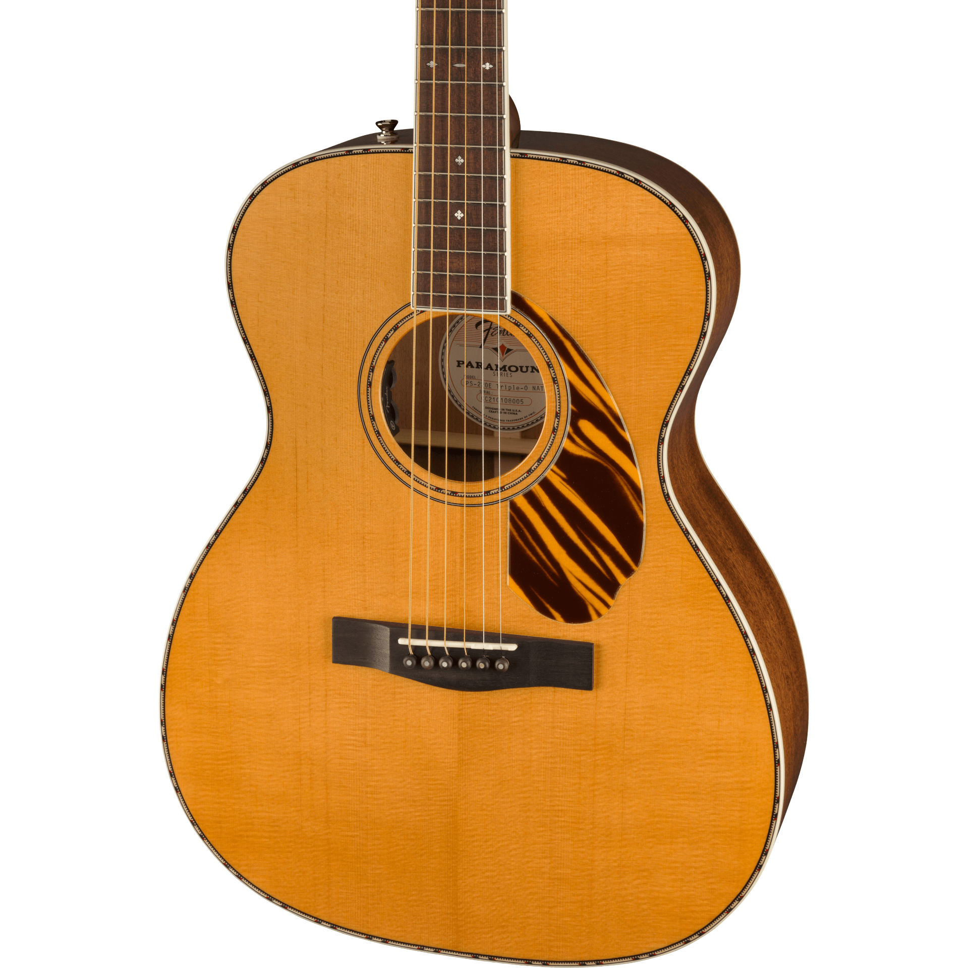 The Paramount PO-220E combines state-of-the-art craftsmanship with vintage-inspired appointments, delivering the best of both worlds. Built with the choice of a solid spruce or solid mahogany top paired with solid mahogany back and sides, the PO-220E features an offset X-bracing pattern that has been carefully refined to optimize resonance and tone. A Fender and Fishman®-designed pickup amplifies the warm, mid-focused tone of the PO-220E’s newly designed orchestra body shape, while the soundhole-mounted controls preserve the vintage aesthetics. Under the top, a body-sensing pickup enhances the soundboard's vibrations which can then be blended with the undersaddle Sonicore pickup.