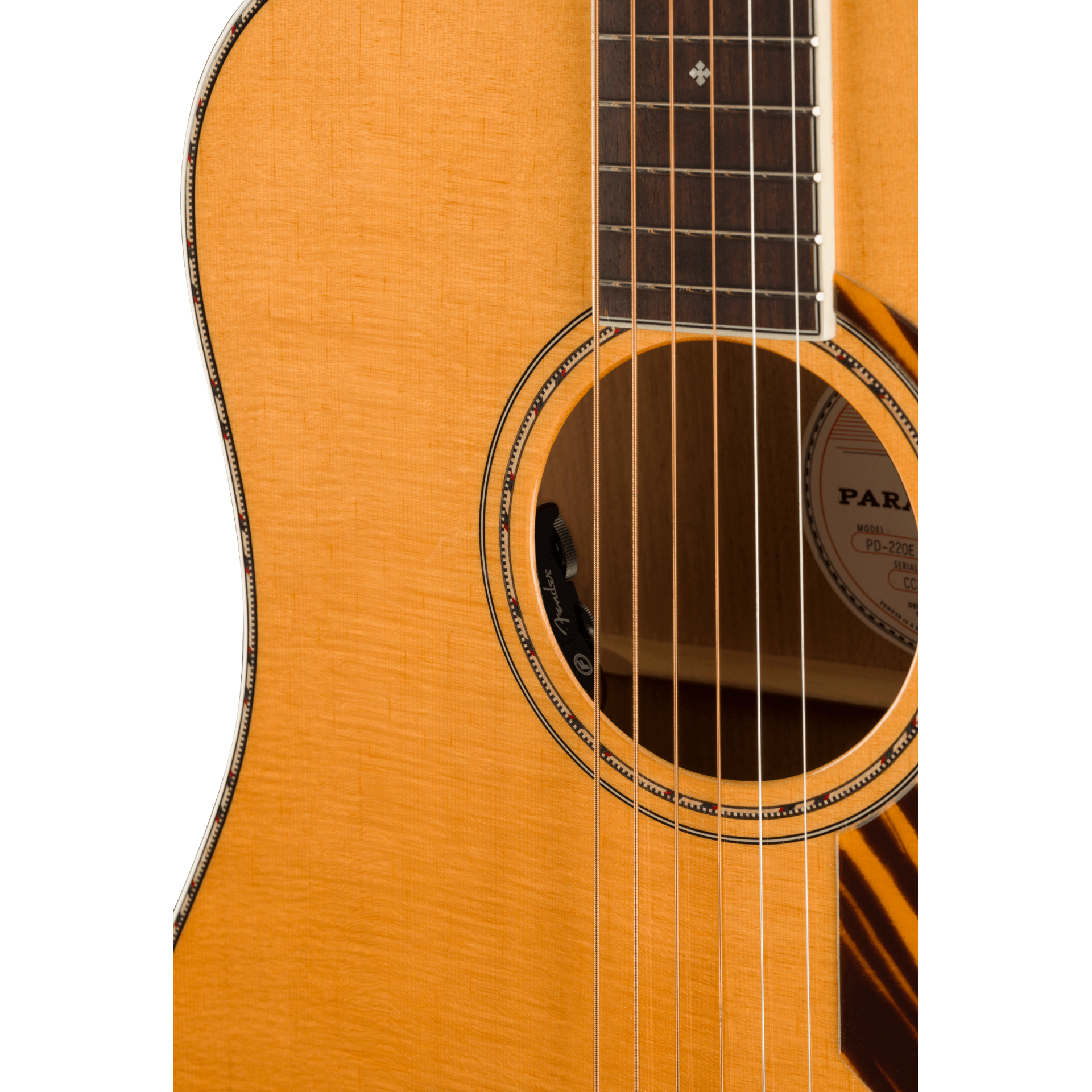 Updated cosmetics include snowflake-shaped pearloid fingerboard inlays, feathered purfling, rosette, and backstrip, and a Black or Tiger Stripe pickguard. The PO-220E also features an ovangkol bridge and fingerboard, slim-taper mahogany neck, bone nut and saddle, and comes with a hardshell case.