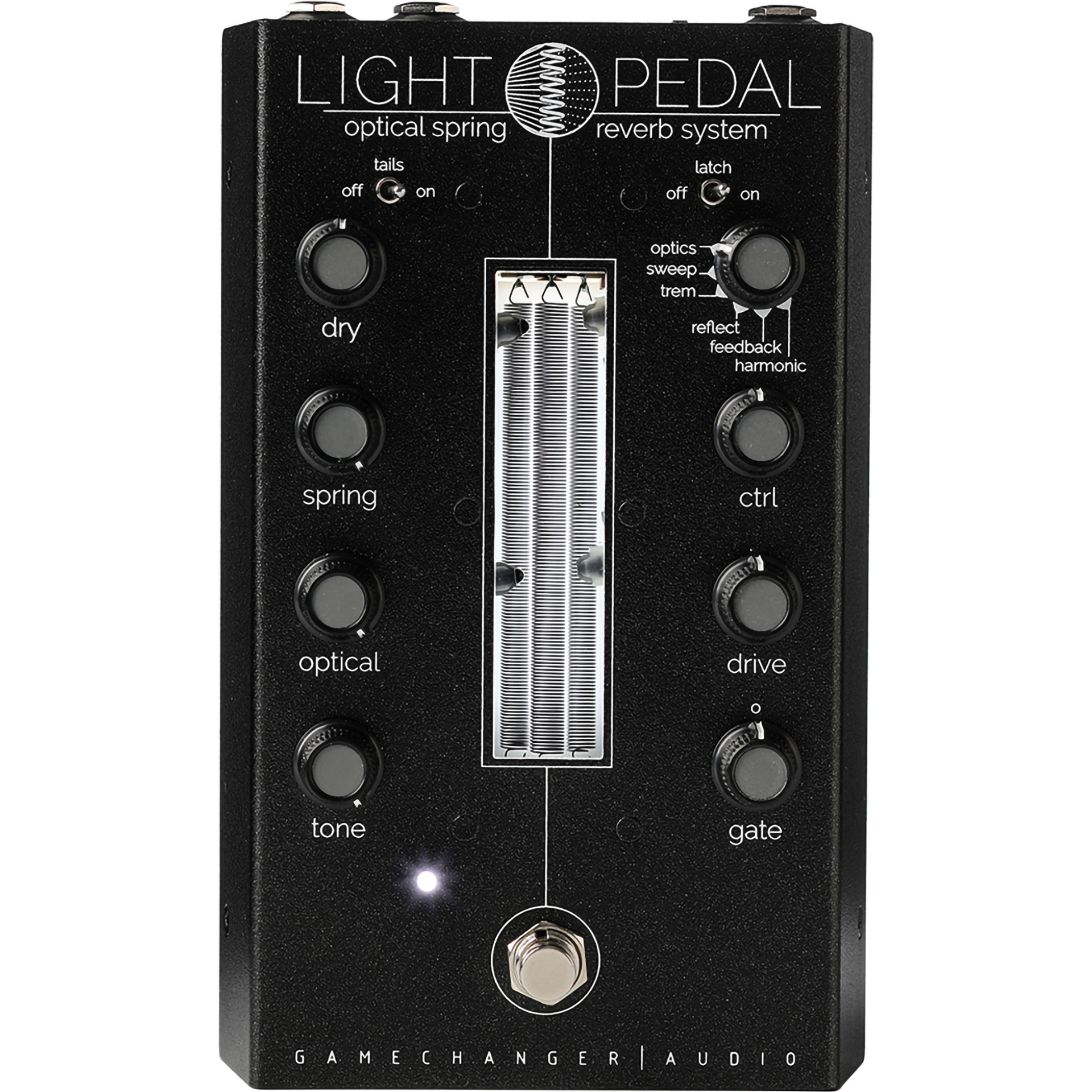 The LIGHT Pedal uses extremely sensitive optical sensors directed at different points of the spring. The optical sensors detect very subtle movements on the spring’s surface as sound-waves travel through it. This method allows to pick up a much wider range of frequencies, overtones and textures otherwise lost in the mechanical reverberation process. The optical sensors also open doors to effects that are new to spring reverbs, such as tremolo, modulation, feedback and added harmonics. The result is a wide variety of reverb sounds ranging from classic to experimental to pure magic.