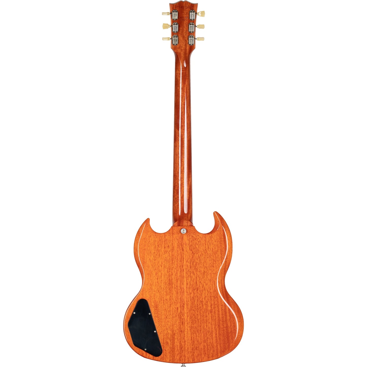The SG Standard ‘61 Sideways Vibrola returns to the classic design that made it relevant, played and loved -- shaping sound across generations and genres of music. As the name implies, the Gibson SG Standard '61 Sideways Vibrola is equipped with the unique Sideways side-pull action vibrato similar to those found on the early 60's models. Standard features include a slim taper mahogany neck and a bound rosewood ngerboard. The mahogany body features a deeply sculpted body scarng, a 5-ply teardrop pickguard and a 22nd-fret neck joint. The nickel plated hardware includes a classic-style Tune-O-Matic bridge and keystone tuners in addition to the Sideways Vibrola Tailpiece. The pickups are 61R and 61T humbuckers for a classic voice with added power and top end. Controls feature audio taper potentiometers and orange drop capacitors.