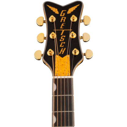 The Fishman® Presys III pickup/preamp system provides a modern sonic complement to classic touches including a solid spruce top with maple back and sides, mahogany neck, 12”-radius laurel fingerboard with 20 vintage-style frets, pearloid Neo-Classic™ thumbnail inlays and synthetic bone nut, laurel bridge, gold sparkle binding and vertical wing” Gretsch headstock logo, gold plexi pickguard, gold hardware, and more