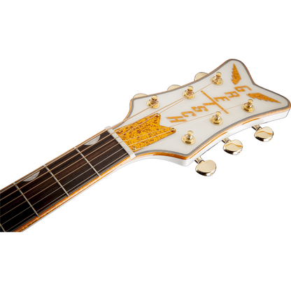 Other Features V-Shaped Matching White Painted Falcon Headstock with Gold-Sparkle Inlaid Gretsch Vertical Winged Logo, Traditional Gretsch Rancher "Triangular" Sound Hole, Gold Sparkle Bound Body Neck and Headstock with B/W/B/W Purfling, Gold Sparkle Heel Cap, Synthetic Bone Nut, Knurled Strap Retainer Knobs, Adjustable Truss Rod with Headstock Adjustment