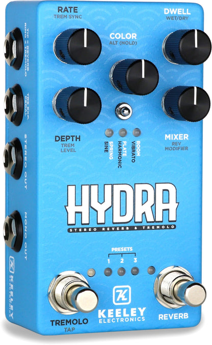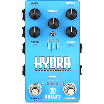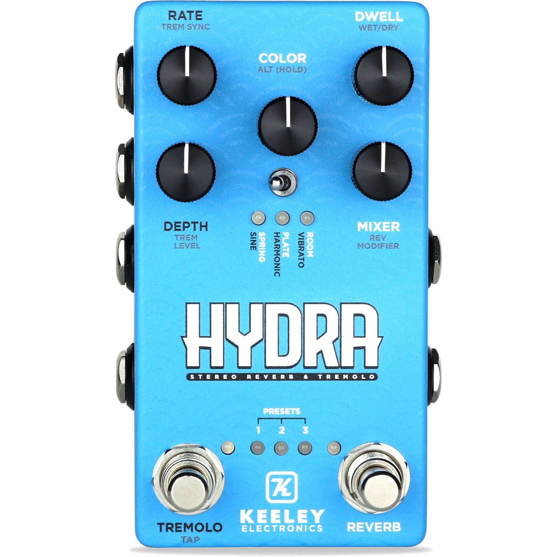 The HYDRA combines high-fidelity Reverb and Tremolo to add space and dimension to your guitar, bass, or keyboard signal. After the team at Keeley completed the ECCOS, we wanted to craft the perfect companion pedal, and we did just that with our new, feature-rich blue box.