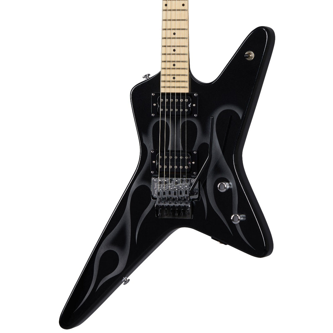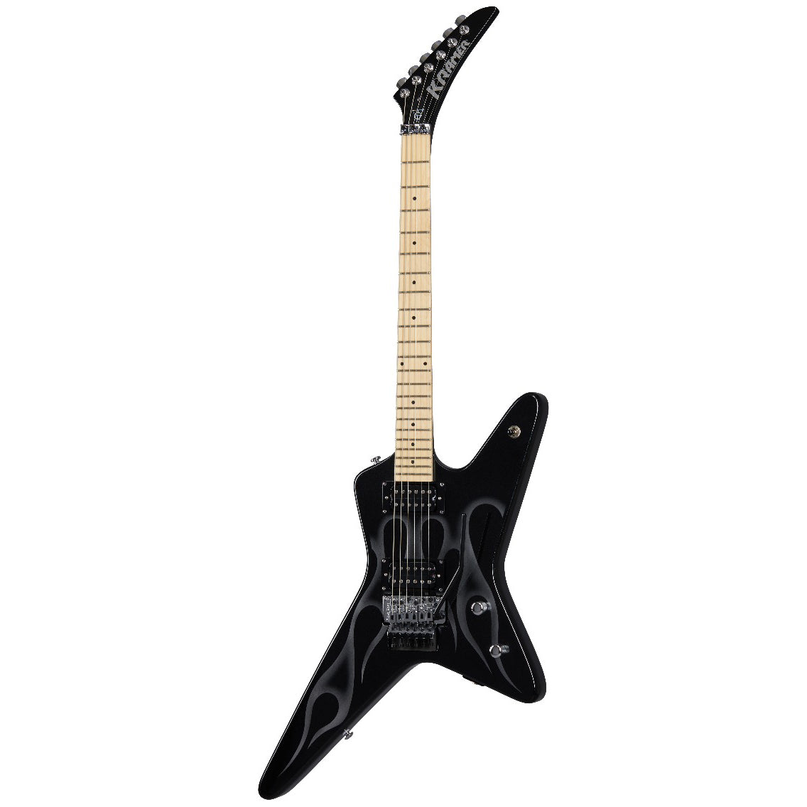 The Tracii Guns Gunstar Voyager is ready to rock and is the first Kramer signature model for the L.A. Guns guitarist. The Gunstar features a star-shaped mahogany Voyager body with a Black Metallic finish and flame graphics, a 3 piece set maple neck with a Slim C profile, and a classic Kramer pointy headstock with a Kramer Pyramid logo on the front and a chrome wrench holder on the back, two Epiphone™ ProBucker™ pickups, each with its own volume control and coil-splitting push / pull switch for broad tonal flexibility, and a Floyd Rose® 1000 series tremolo and topmounted R2 Locking Nut and chrome string retainer bar. A Kramer premium gig bag is included.