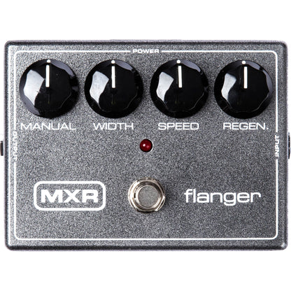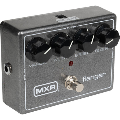 Back by popular demand, the MXR flanger creates a variety of wild sounds from dynamic jet plane or cool space effects to short delay, chorus and vibrato. Back off Width to zero to disengage auto-sweep, then use the Manual knob to physically place the effect anywhere along the frequency spectrum; Use with guitar, bass, keyboards or vocals! Power: Two 9-volt batteries (some early models may not have this feature), or Dunlop ECB-004 18-volt AC Adapter - Controls: Footswitch toggles effect on/bypass (red LED indicates on) Manual knob selects frequency center of effect when auto-sweep is disengaged Width knob at zero disengages auto-sweep, rotates clockwise to increase total phase sweep of effect Speed knob modulates rate of effect Regen knob feeds effect back onto itself at adjustable intensity, increasing the total phase effect.