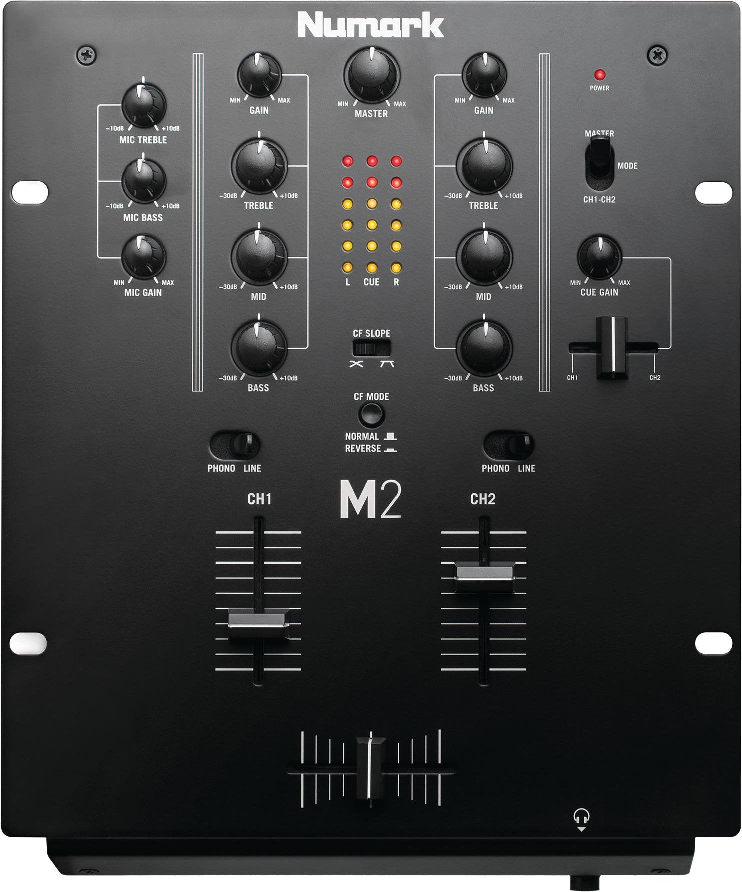 M2 is a two-channel DJ scratch mixer with all the essentials to hit the stage in Numark style. Switchable phono/line inputs for turntables, CD players, and other line sources make M2 a superb choice for any DJ setting from weddings to clubs, parties to practice setups. A mic input with dedicated EQ and gain, and a headphone output with crossfader-style cueing complete the plentifully featured package. Three-band EQ on each channel plus crossfader-reverse and slope controls give you all the tools you need to drive your audience from behind the wheels of steel. M2 is the perfect mixer for any scratch DJ.