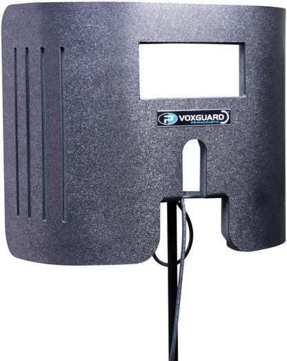The VoxGuard features high-density open cell acoustic foam that provides maximum absorption throughout the vocal range. An extra large high impact ABS outer shell keeps unwanted noise out, while innovative slotted ports prevent excess bass buildup and resonance commonly associated with stand-mounted absorbers. Once mounted, a rear access cable port allows any hand held or studio microphone to be articulated and directed at a specific source. The VoxGuard has been updated for 2015 and now features a window that allows the vocalist to maintain visual communication between the engineer, producer or other band members.