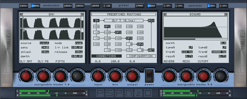 - up to four modulators at a time; the list includes: LFO, envelope detector, ADSR step sequencer