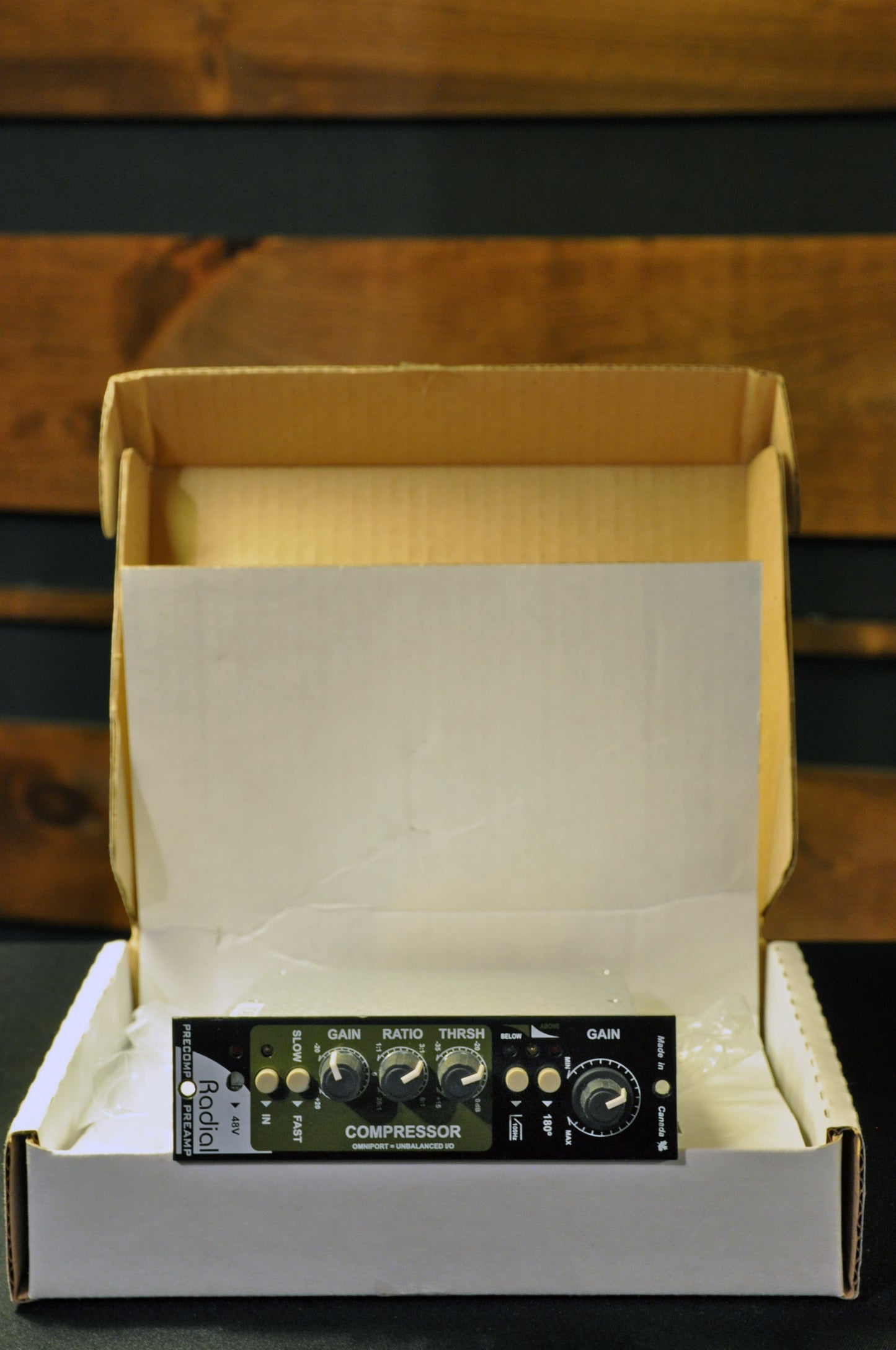 The single wide module begins with a high performance preamp that can deliver in excess of 60dB to handle all types of microphones. Equipped with Radial's unique Accustate gain control, the PreComp simultaneously sets the output and sensitivity to maximize signal-to-noise at all levels. This is particularly important when recording in the digital domain where background noise can often be audible during quiet passages. A full-feature VCA compressor follows with adjustable threshold, compression ratio and gain make-up controls. The advanced compression algorithm reads the program material and automatically transitions from soft-knee to hard knee as the signal rises above the threshold. A simple slow-fast switch makes it easy to set the PreComp for either vocals or percussion.