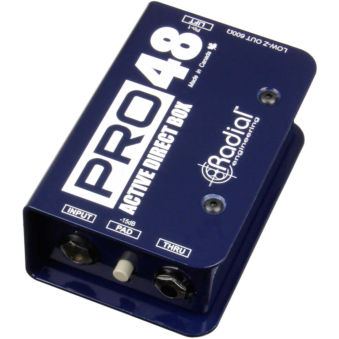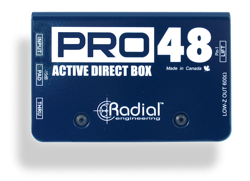 The Radial Pro48 is a high-performance 48V phantom powered active direct box designed specifically for today's higher output instruments. The Pro48's inovative digital switching power supply significantly increases headroom and allows for less distortion while yielding a smooth, linear response extending from 20Hz to well above 100kHz resulting in natural, uncolored signal transfer. This superior performance makes the Pro48 an ideal candidate for use with today's battery powered active basses and acoustic guitars that tend to overload other direct boxes. The compact Pro48 is built road-ready with 14 gauge steel in our unique book-end design that provides protective zones around the switches and connectors. The internal welded I-beam construction assures outside stress will not torque the PC board thus assuring longer product life. Exceptional sonic performance, great natural tone at an affordable price; the Radial Pro48 truly represents a breakthrough in value! The Radial Pro48 Blue is True!