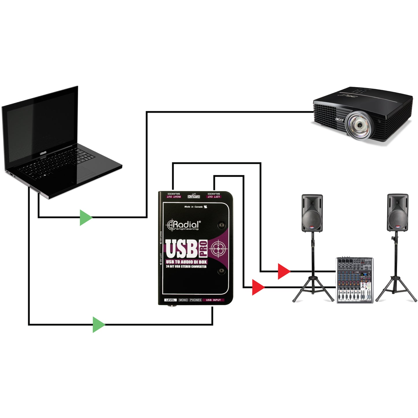 The Radial USB-Pro is a high-resolution stereo direct box designed to convert sound files from a laptop computer and seamlessly transfer them to a pair of balanced audio outputs to feed a PA, recording or broadcast mixing console.