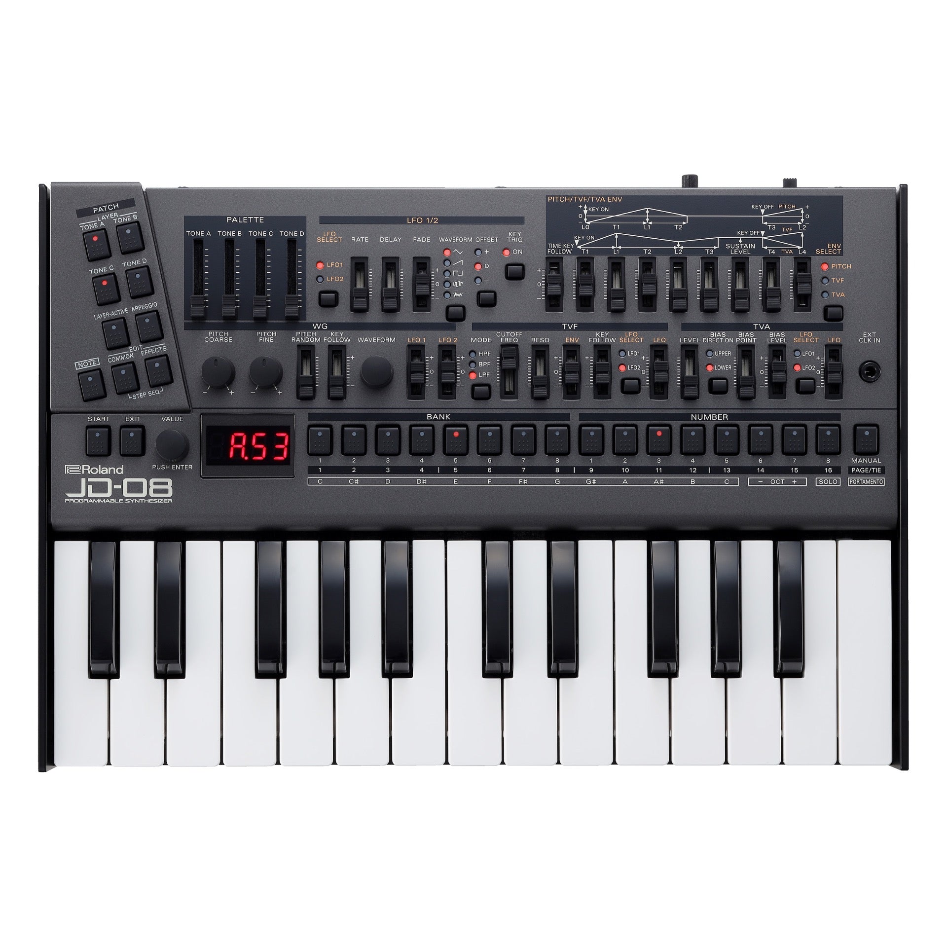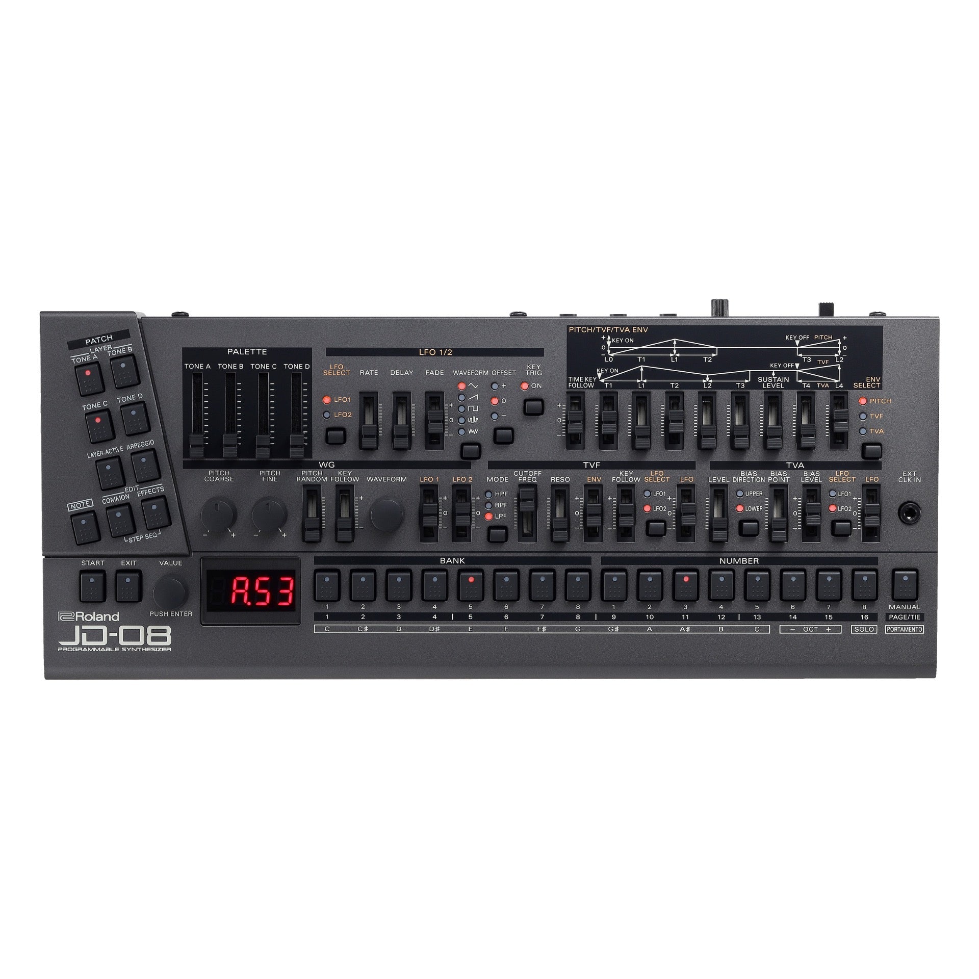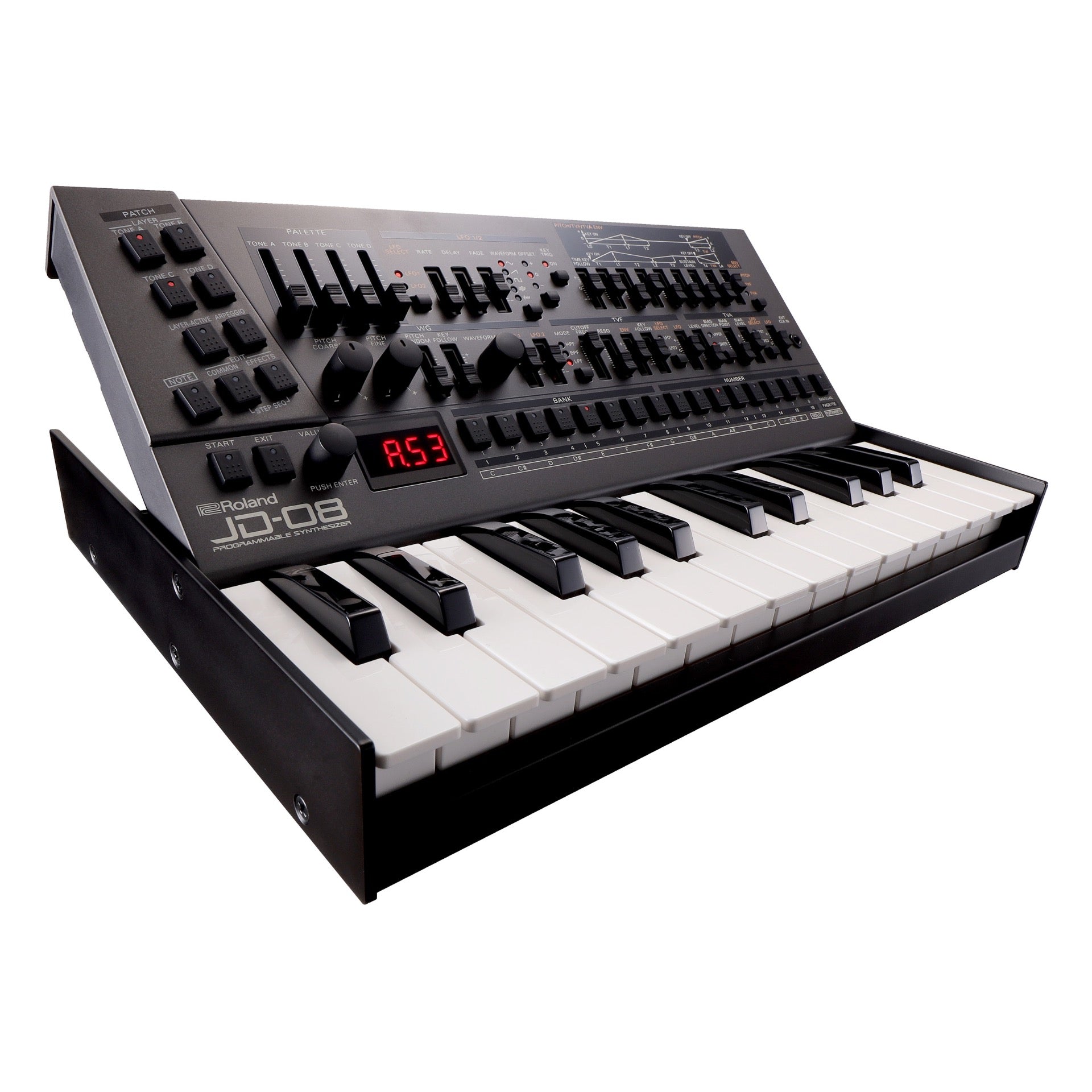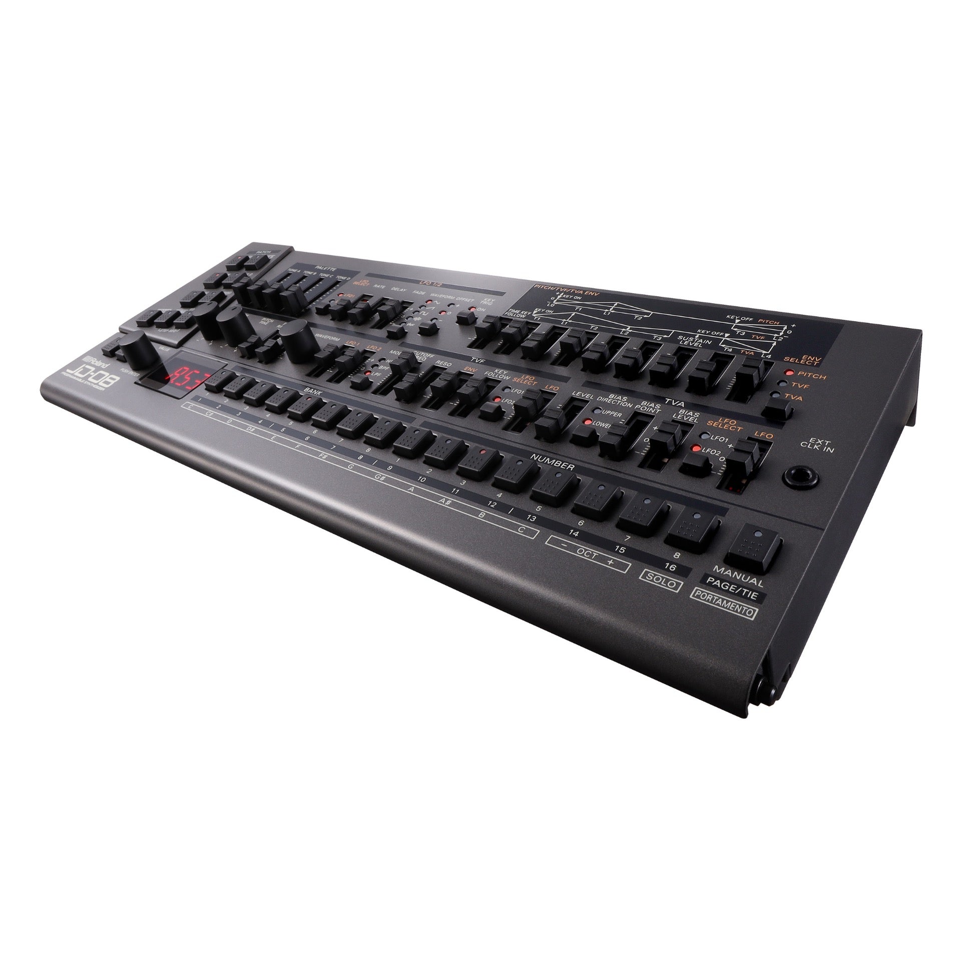 With its retro workflow, evocative sounds, and powerful effects, the JD-800 was a favorite for top electronic music producers through the ’90s and beyond. Combining the original JD-800 waveforms with advanced modeling techniques, the JD-08 delivers the exquisite hands-on sound design of the original, along with hugely expanded polyphony, a two-part polyphonic sequencer, and other modern updates.