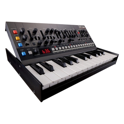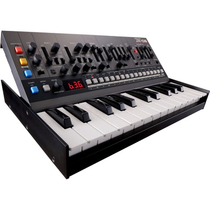 The compact JX-08 fits just about anywhere and is easily controlled from a master keyboard or computer DAW. It can run on standard AA batteries for hours of uninhibited jamming, and there’s also a built-in speaker for on-the-go sound monitoring. Add a DK-01 Boutique Dock for a polished look and three convenient tilt positions, or grab a K-25m Keyboard Unit to create a fully self-contained, portable instrument.