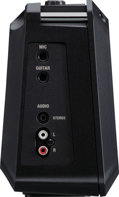 • Three-channel mixer with individual volume controls for microphone, guitar, and audio input