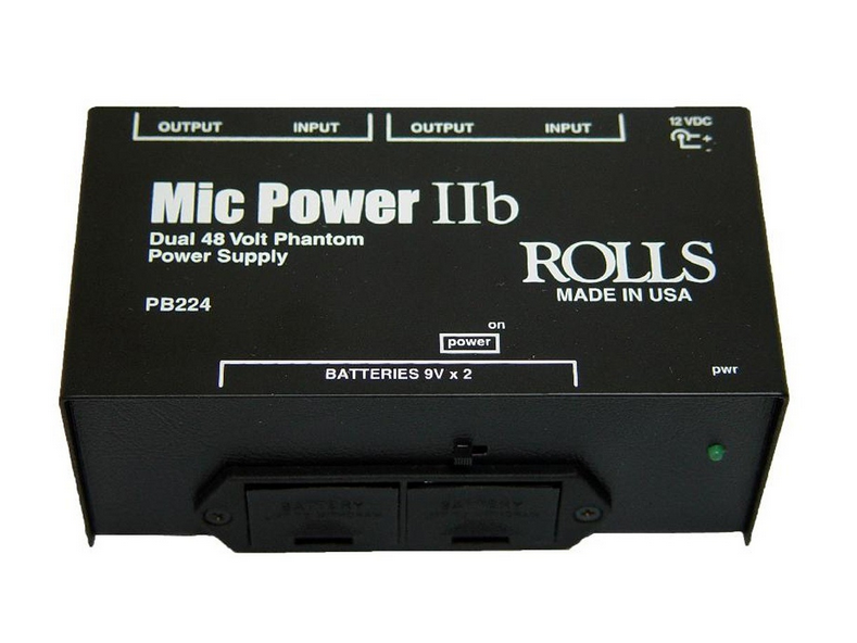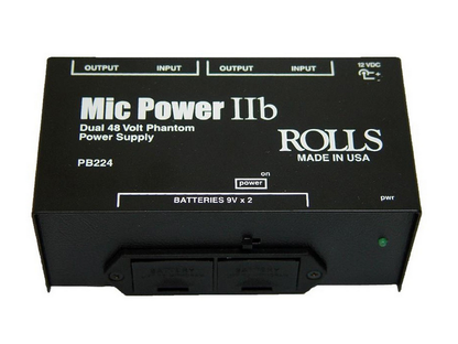 The Rolls PB224 is a lightweight, low-cost, 2-channel 48 Volt phantom power supply for condenser microphones, operating off of 2 9V batteries. The unit features redesigned voltage supply circuits for clean phantom power output, and a durable, molded plastic battery compartment.