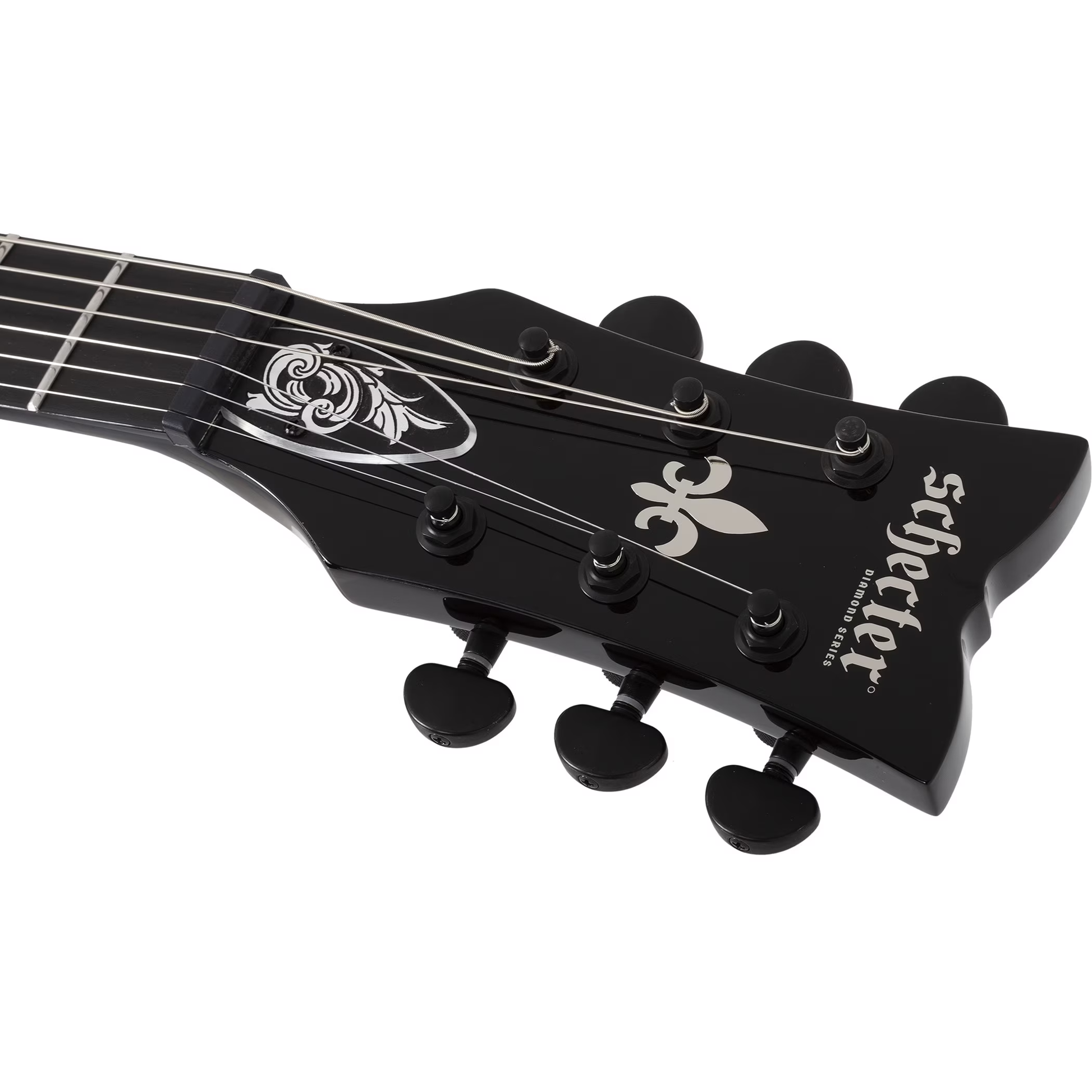 The neck is 3-piece maple with carbon fiber reinforcement rods and a Thin "C" profile. The ebony fingerboard has a 12"-16" compound radius, 22 X-jumbo stainless steel frets, and unique inlays with lines at the 11th and 13th frets and chains at the 12th. Side dots are Luminlay glow-in-the-dark. Scale length is 24.75" (628 mm). Neck thickness measures 20 mm at the 1st fret and 22 mm at the 12th fret. The nut is Graph Tech XL Black Tusq, 42 mm wide, and the truss rod is a 2-way adjustable rod with a 5/32" (4 mm) Allen nut. Locking Schecter tuners are included.