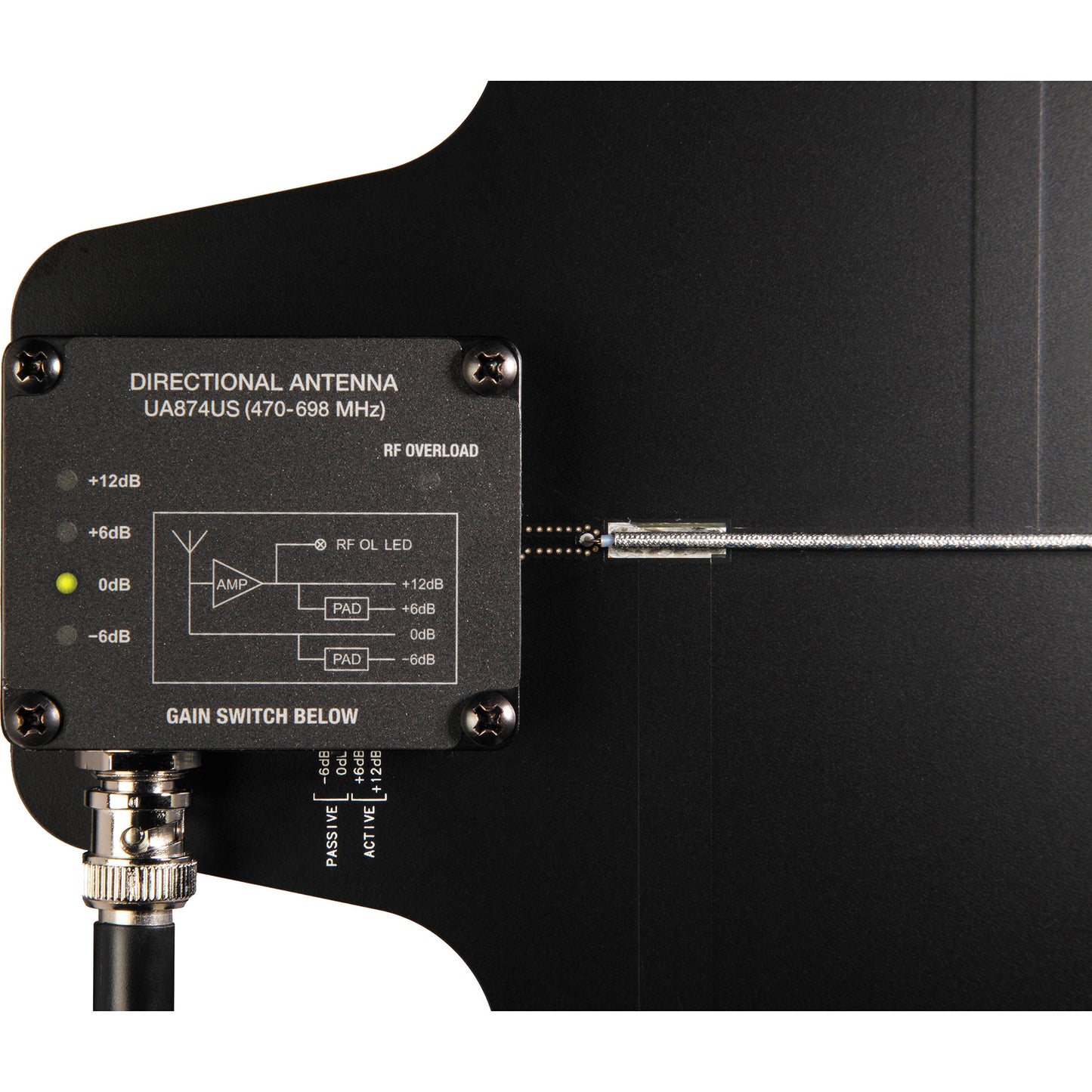 Experience improved wireless reception with the UA874. This UHF antenna uses a log periodic dipole array to produce a cardioid pattern toward the desired coverage area, achieving greater rejection of RF signals outside the area than standard ½ wave omnidirectional antennas.