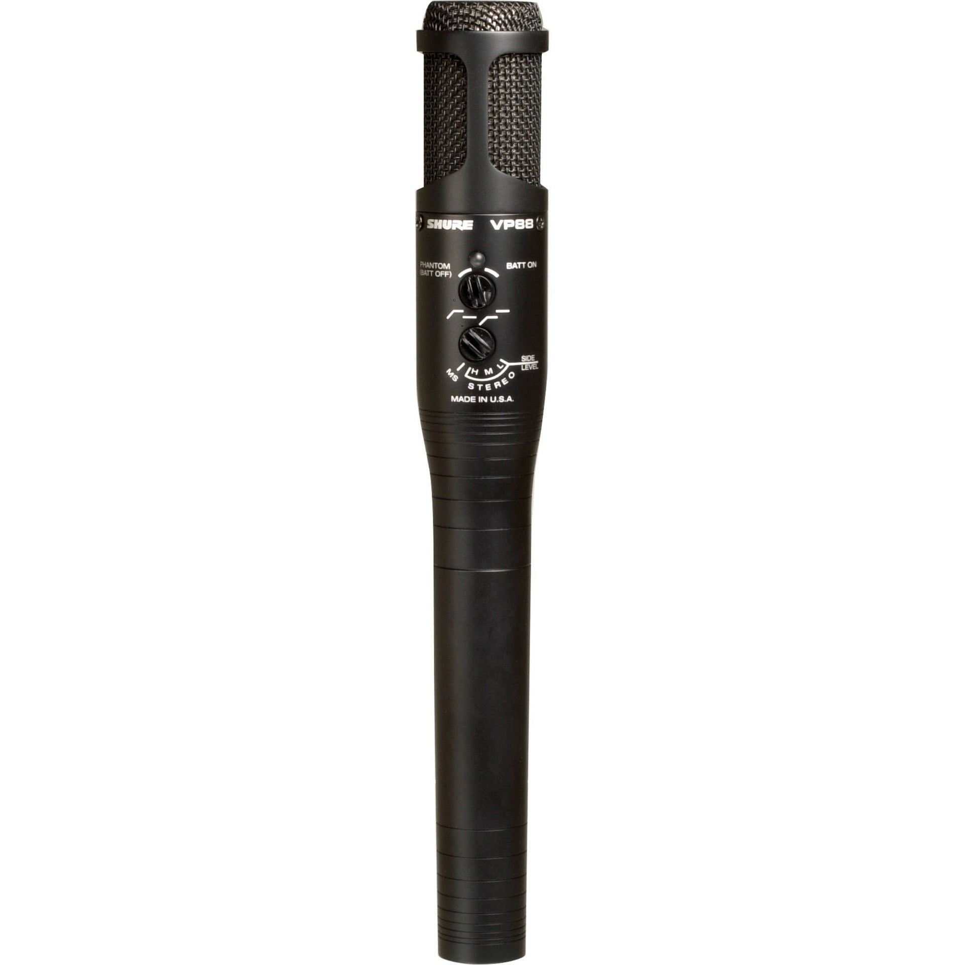 The Shure Model VP88 is a single-point, stereo condenser microphone for use in professional studio recording, field production, electronic news gathering (ENG), and studio broadcasting applications. It combines two condenser cartridges in a single housing to create a stereo audio image of the sound source. It is unique in its ability to capture the realism of a live event and yet withstand rigorous field production environments.