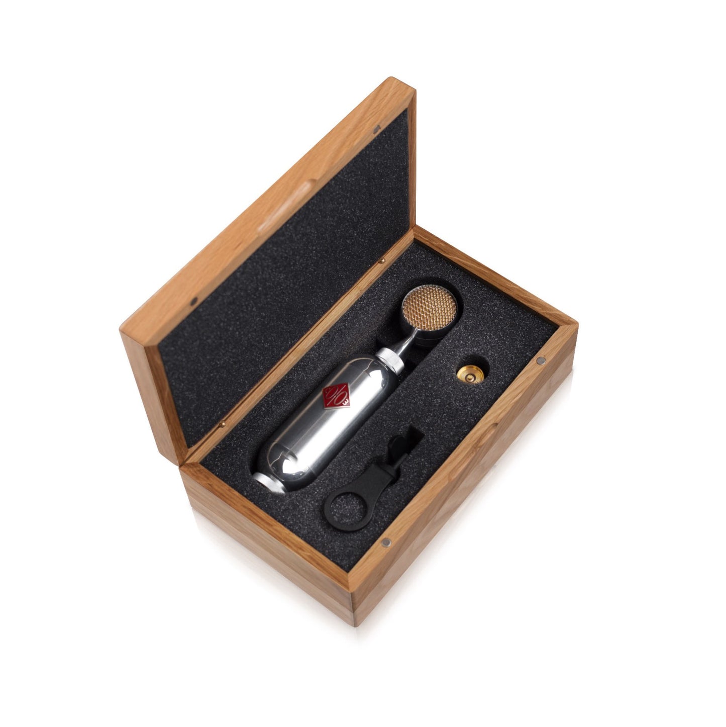 The package includes a mic clip, as well as a beautifully designed wooden case with form fitting foam to secure the microphone. The custom case is latched with heavy duty magnets to ensure safe travel from the mic locker to your live room or isolation booth.