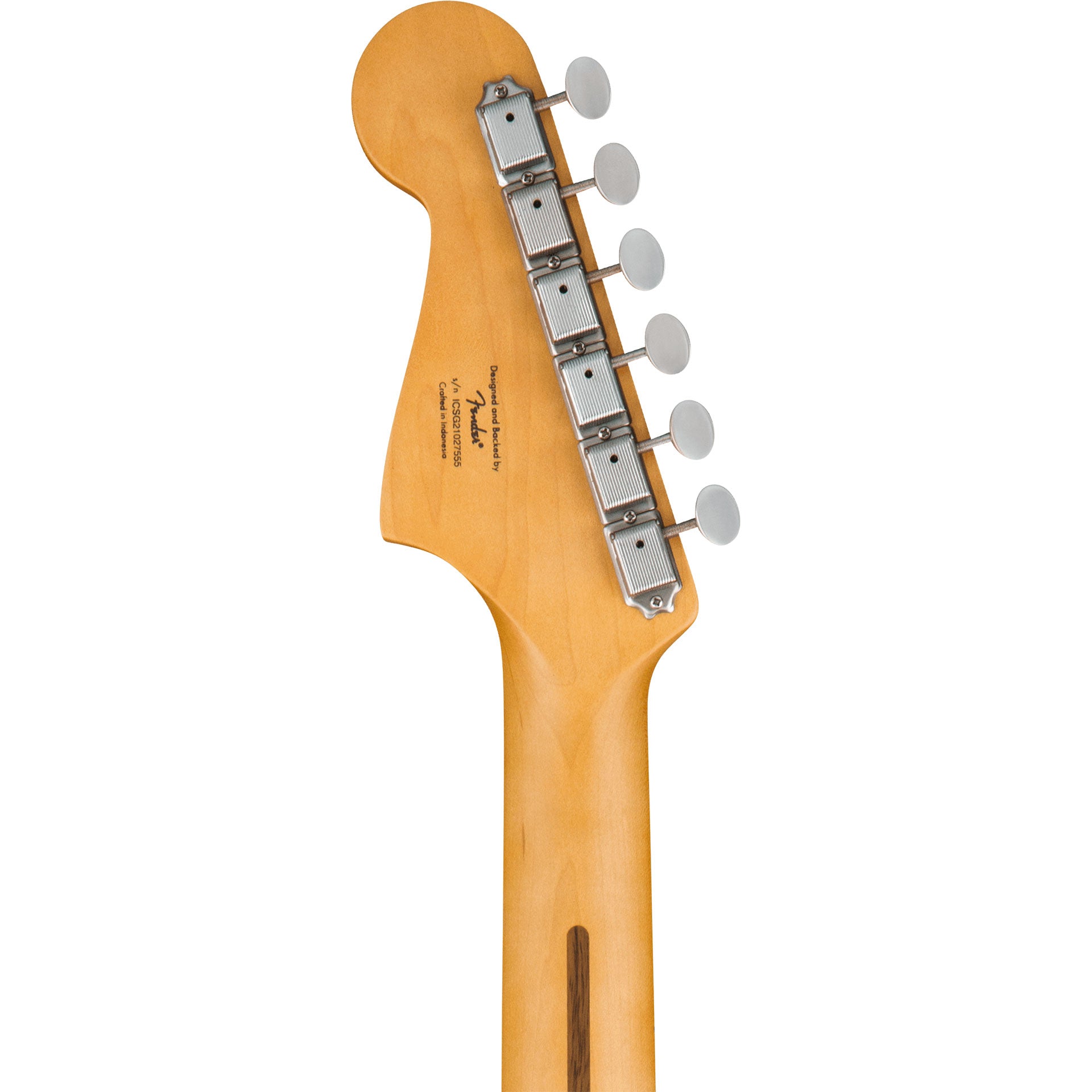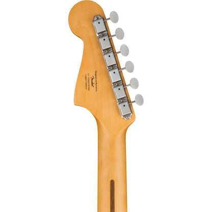 The Squier® 40th Anniversary Jazzmaster®, Vintage Edition is a soulful tribute model trimmed with a collection of classic features for the retro-minded Squier enthusiast. Featuring aged chrome hardware, an anodized aluminum pickguard, a vintage-tinted maple neck, an engraved anniversary neck plate and satin finish throughout, this Jazzmaster honors the heritage of the Squier catalog and its ancestry. Player-friendly refinements of this commemorative model include a slim and comfortable “C”-shaped neck profile for an easy playing feel, vintage-style tuning machines and 6-saddle floating bridge and tremolo for authentic performance and style, and Fender-Designed single-coil pickups with alnico 5 magnets for familiar Jazzmaster tone.