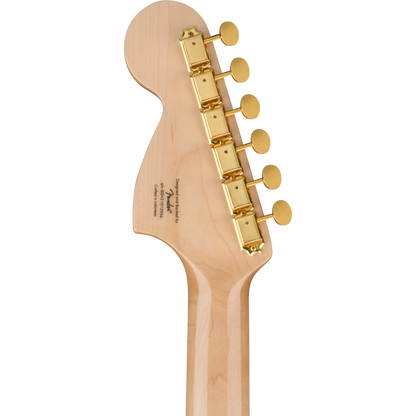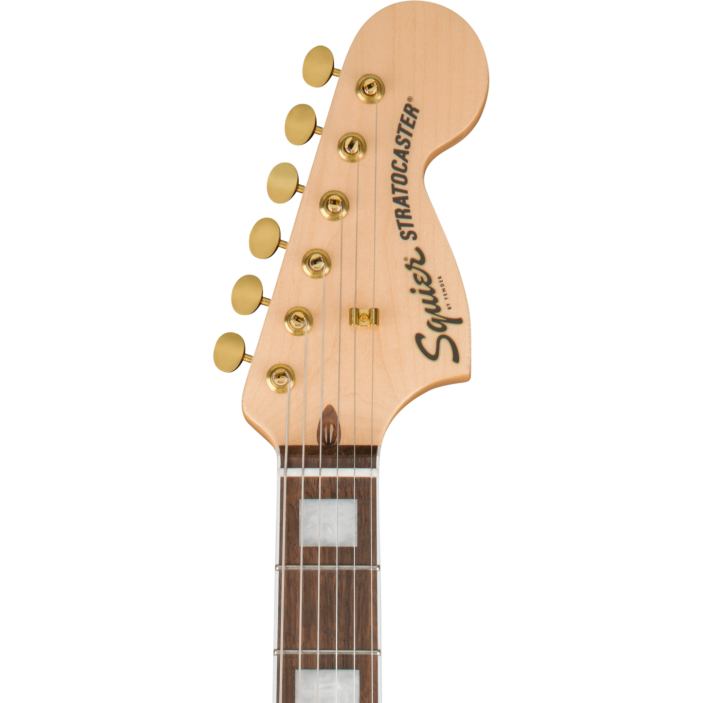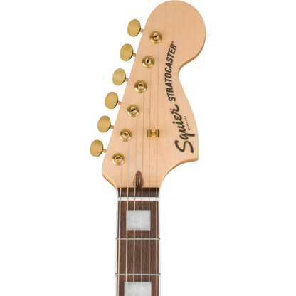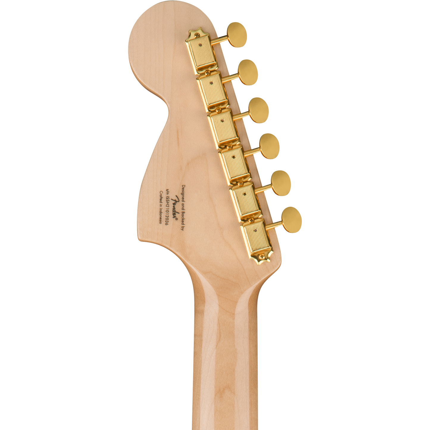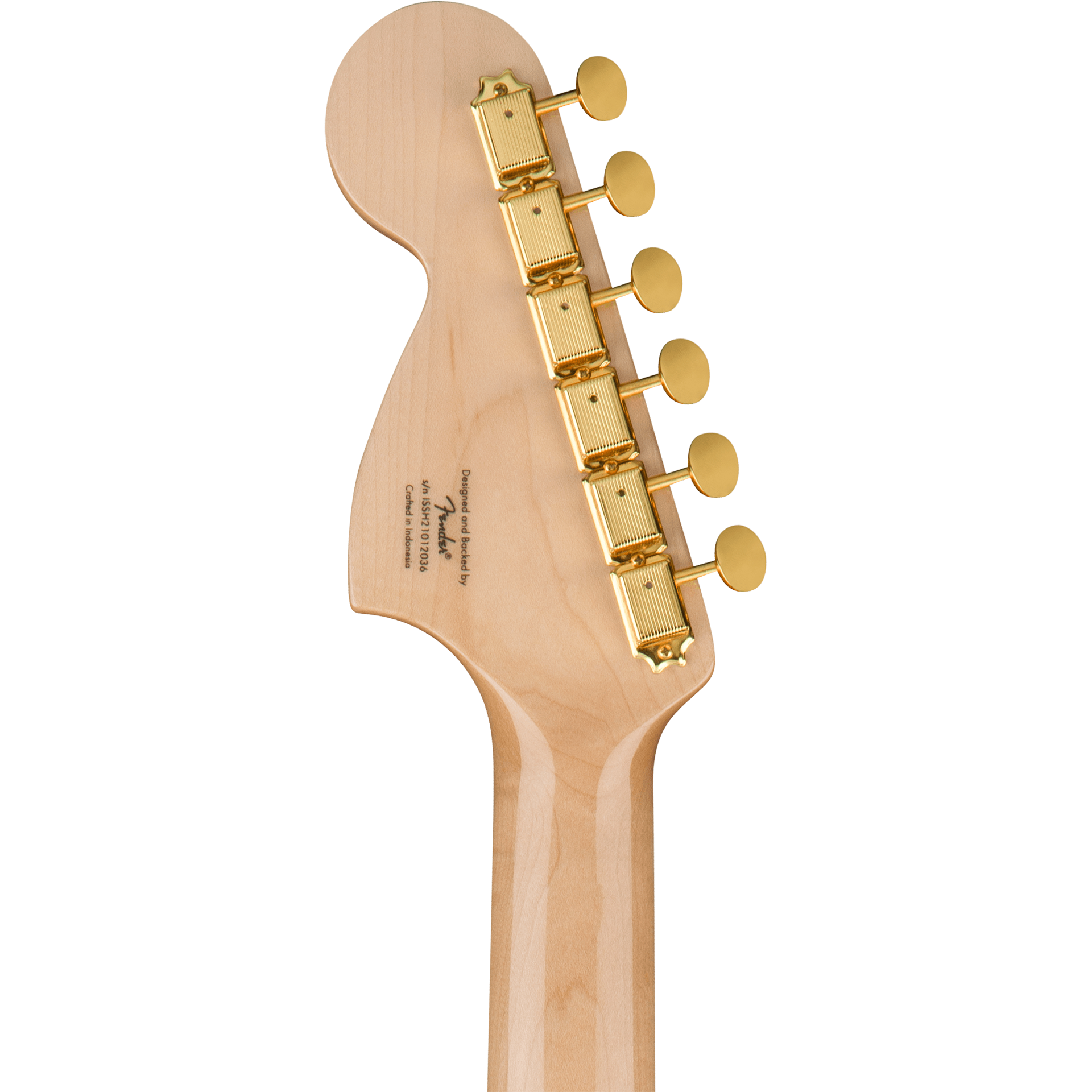 The Squier® 40th Anniversary Stratocaster®, Gold Edition is a stylish model adorned with an eye-catching collection of upscale features for the discerning Squier fanatic. Featuring striking gold-plated hardware, a gold anodized aluminum pickguard, a bound Indian laurel fingerboard with pearloid block inlays, an engraved anniversary neck plate and gloss finish throughout, this Strat® is poised and ready for the spotlight. Player-friendly refinements of this commemorative model include a slim and comfortable “C”-shaped neck profile for an easy playing feel, vintage-style tuning machines and 6-saddle synchronized tremolo bridge for authentic performance and style, and Fender-Designed single-coil pickups with alnico 5 magnets for familiar Strat tone.