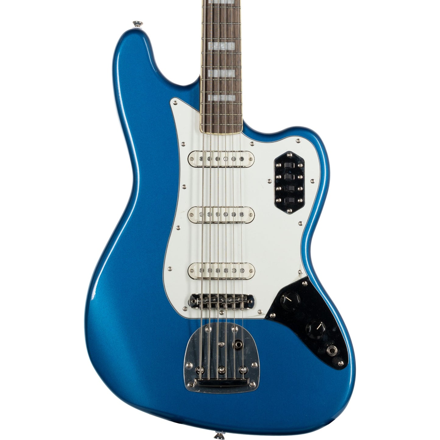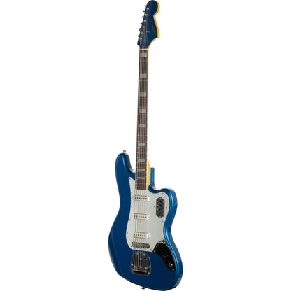 The Classic Vibe Bass VI is a faithful tribute to the secret weapon of producers and adventurous players that have dared to explore it since its original production from 1961 to 1975. Tuned an octave lower than a guitar and featuring a vintage-style tremolo, the Bass VI is the perfect companion to accompany any guitar or bass player into uncharted territory. Player-friendly features include a slim and comfortable “C”-shaped neck profile with an easy-playing 9.5”-radius fingerboard and narrow-tall frets, as well as a floating bridge with barrel saddles. This throwback Squier model also features 1960s inspired headstock markings, nickel-plated hardware and a slick vintage-tinted gloss neck finish for an old-school aesthetic vibe.