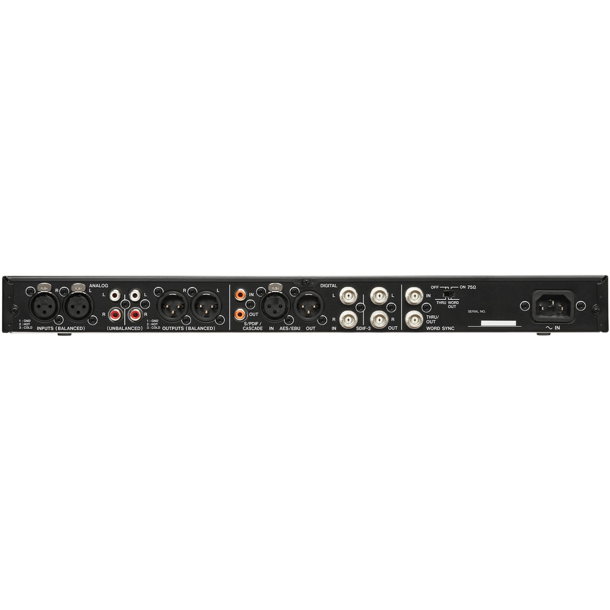 The unit is equipped with a diverse selection of input and output terminals for connection to a variety of studio equipment such as audio interfaces, microphone preamplifiers, dynamic processors, and more. Analog I/O ports are provided via XLR and RCA terminals, while PCM digital connectivity is provided through S/PDIF, RCA, coaxial, and AES/EBU connectors.. DSD digital connections are handled through the use of BNC SDIF-3 terminals.