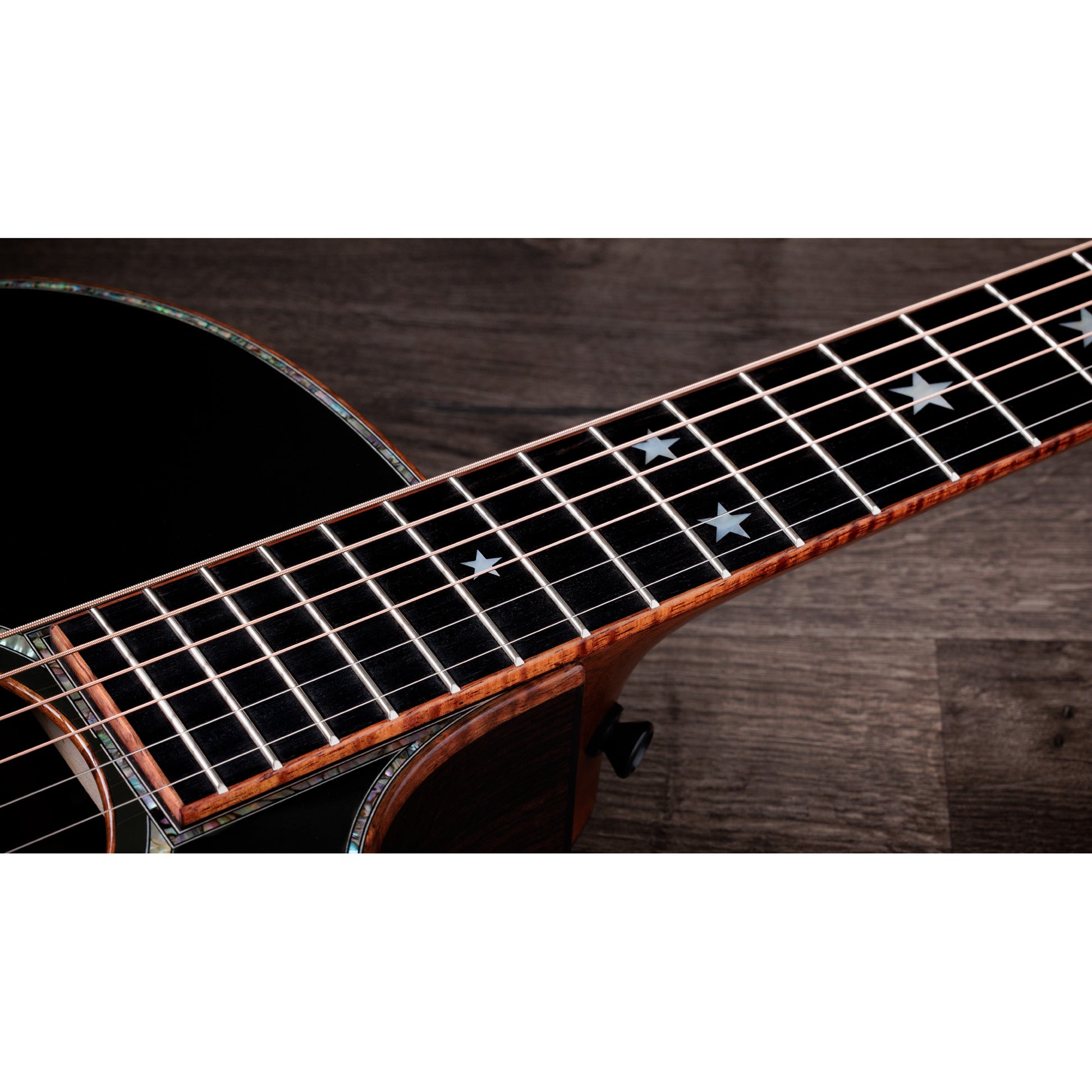 A bold blacktop soundboard commands attention, its dramatic finish beautifully framed by green abalone edge trim and Hawaiian koa binding around the body, soundhole, fretboard, and peghead. Five-Star fretboard inlays and a Faceted Star peghead inlay—inspired by the stars of the U.S. flag—are rendered in mother-of-pearl. The appointment package also includes a figured koa backstrip and heel cap, a green abalone peghead logo, an ebony backstrap, dark-stained bone bridge pins with Australian opal green dots, and Gotoh 510 antique chrome tuners with black buttons. A special interior label indicates this model’s special-edition status.