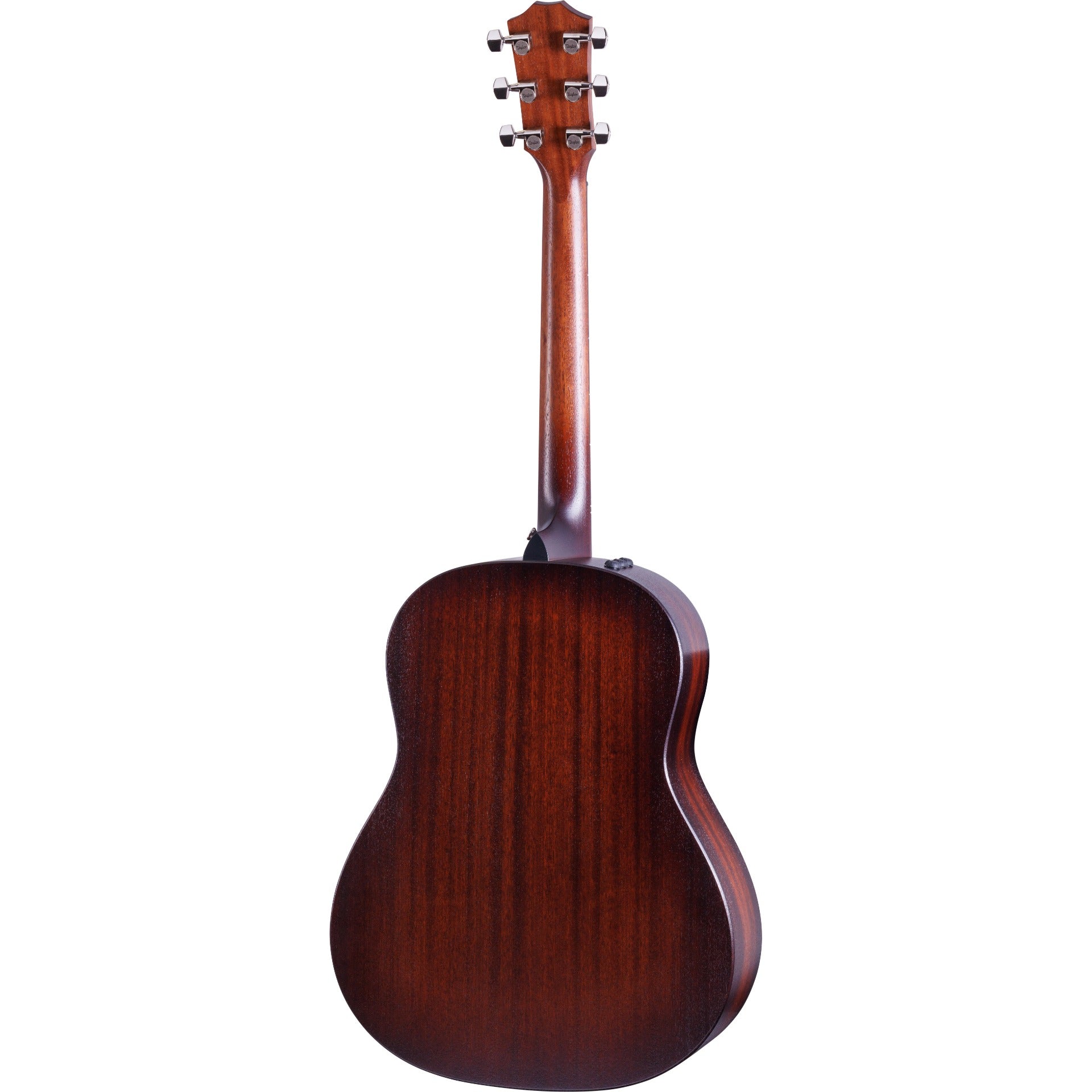 Rounding out the new trio of American Dream Series guitars is the AD27e, a Grand Pacific round-shoulder dreadnought acoustic-electric crafted with solid sapele back and sides and a mahogany top. The larger body shape offers a bit more power and projection than its more compact siblings, generating a rich, dry midrange response with a strong fundamental focus and clear-low end power, an ideal combination for strummers or flatpickers. Inside, our V-Class bracing adds more volume and sustain while also improving harmony between notes across the fretboard. Appointments for this model include chamfered body edges, a single-ring maple/black/maple rosette, 4mm dot inlays in Italian acrylic, Taylor nickel tuners, a faux tortoiseshell firestripe pickguard, and a matte finish with a tobacco stain and a shaded edgeburst for the back, sides, top and neck heel. It ships with ES2 electronics and a gray AeroCase.